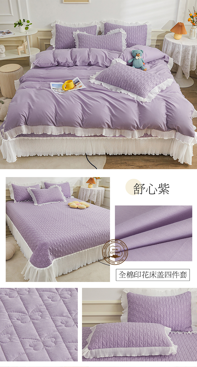 当前位置: 91家纺网 > 商品网购 > 床品套件 > 四件套 > 全棉普通四件套 > 宜凡 2023新款全棉花边床盖三四件套 舒心紫
