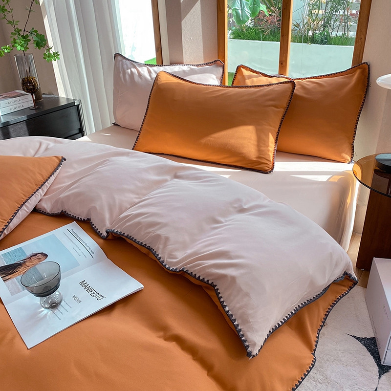 商品名称:妖妖家纺 2023新款水洗棉贝壳边纯色三角针四件套 焦糖+玉