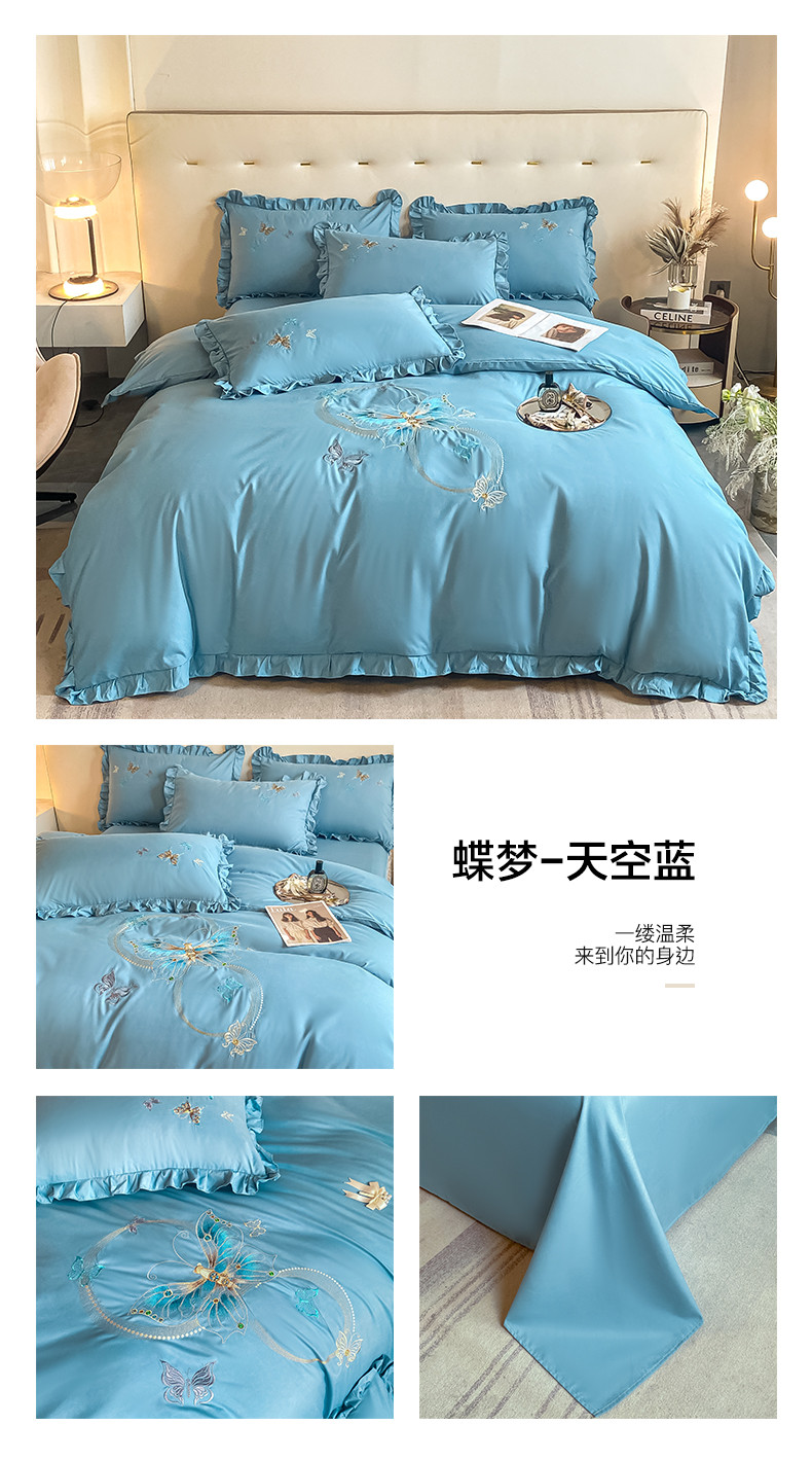 当前位置: 91家纺网 > 商品网购 > 床品套件 > 四件套 > 普通磨毛四件套 > 艺玲 2023新款韩版亲肤磨毛刺绣蕾丝床裙床单如意系列四件套 蝶梦-天空蓝