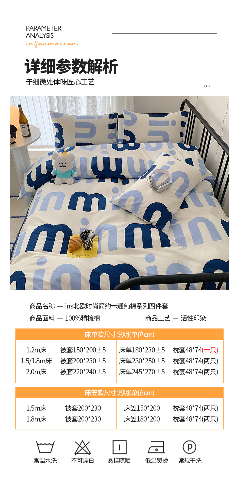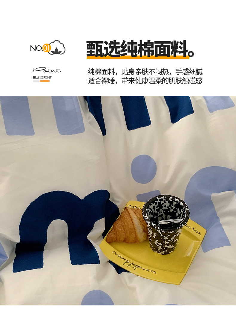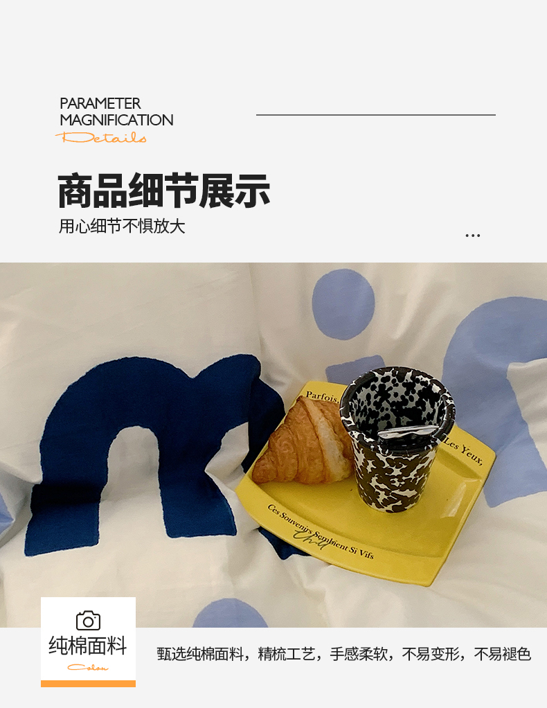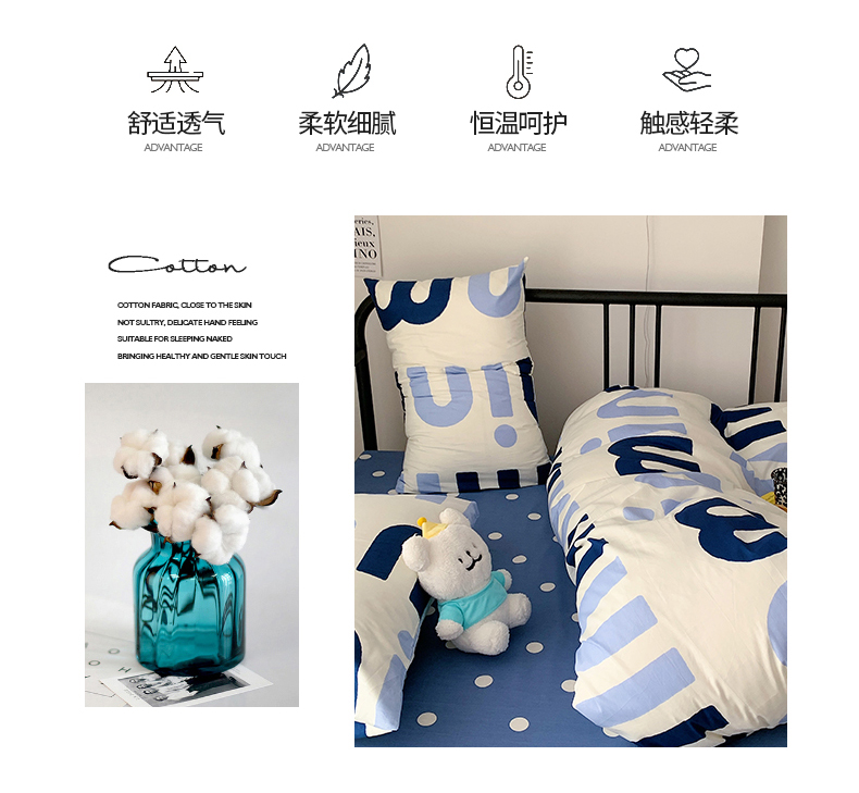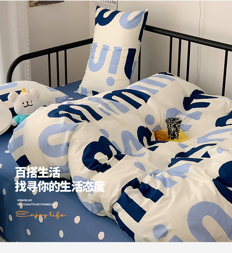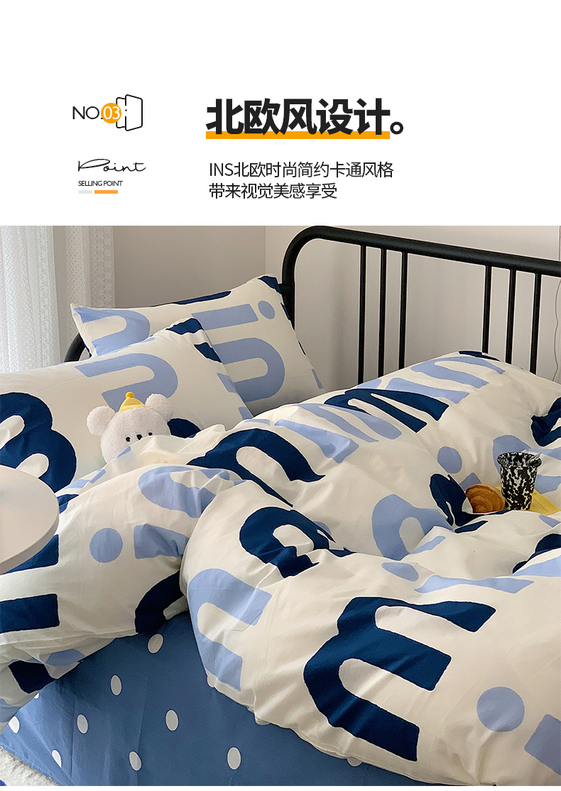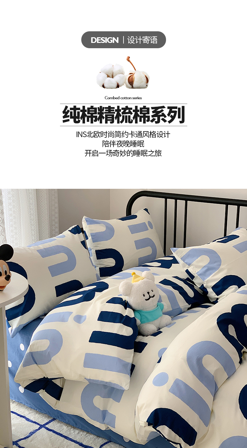 商品名称:桃子家居 2023新款ins北欧时尚简约卡通纯棉四件套系列 棉-蓝色字母
