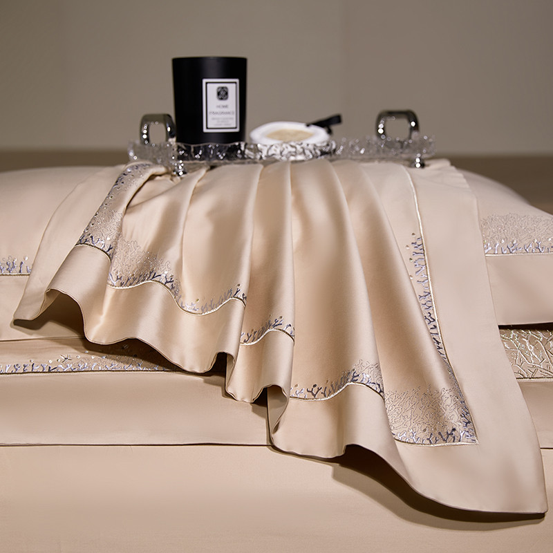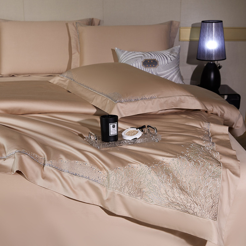 (总)诗黛尔 2025秋冬新款长绒棉刺绣香缇卡系列四件套,卡其色,落樱粉,南瓜橘,绅士灰,水晶兰,油果绿