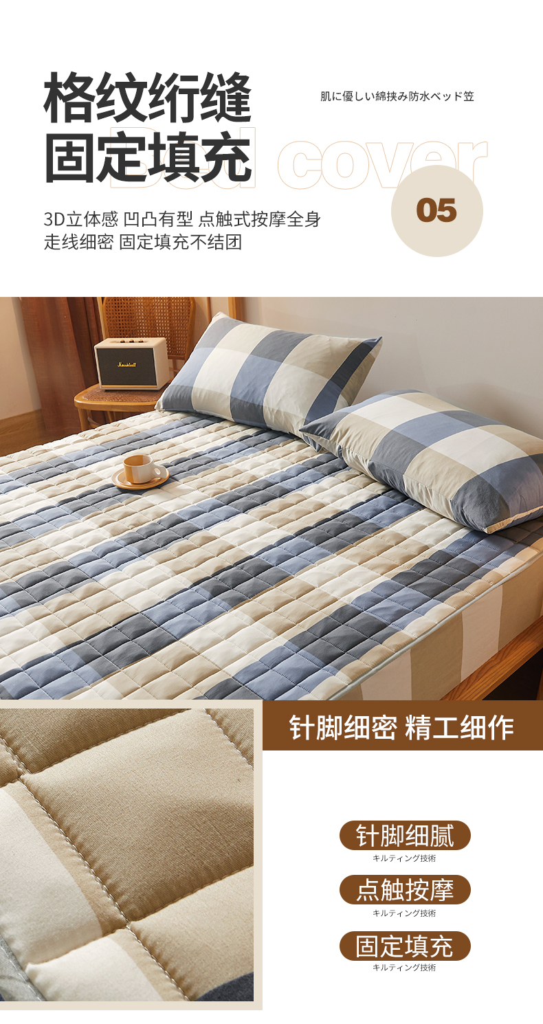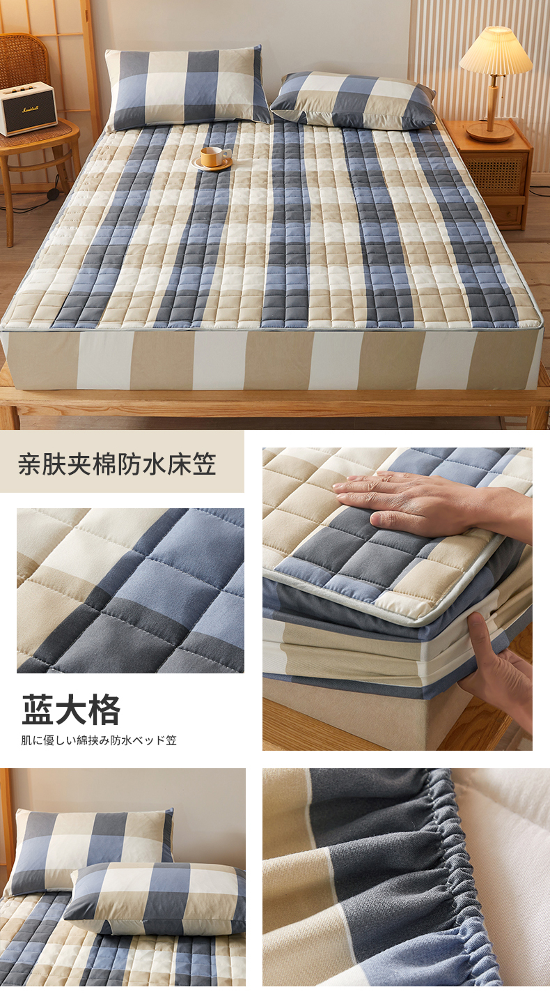 胜权家纺 2024新款亲肤夹棉格子防水床笠 蓝大格