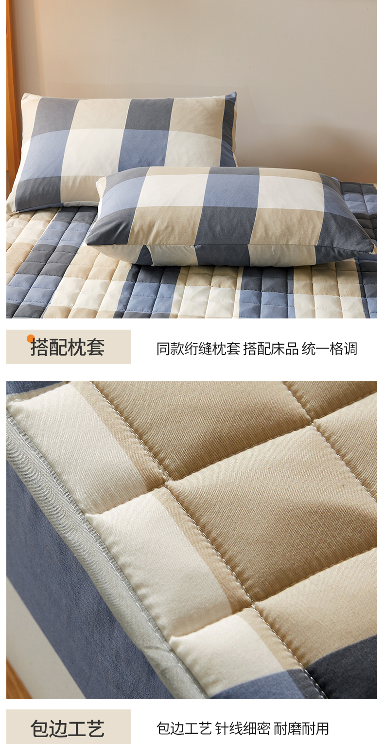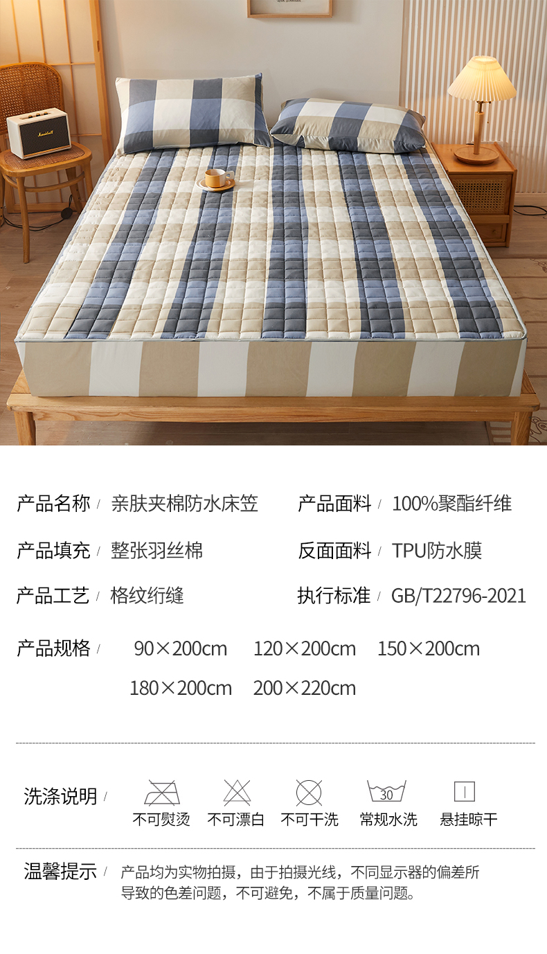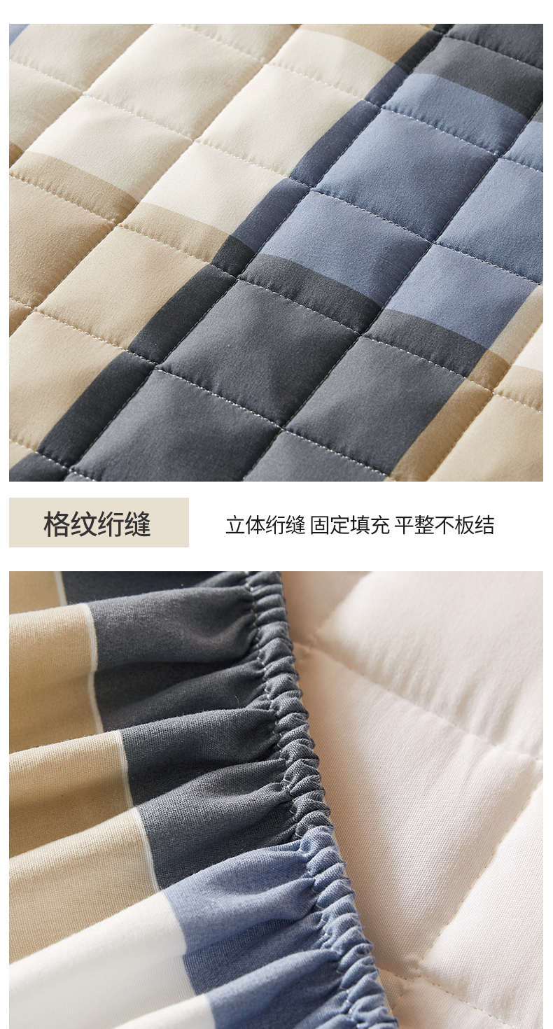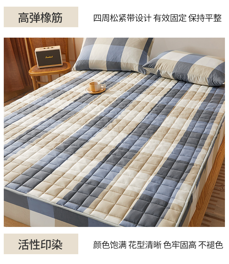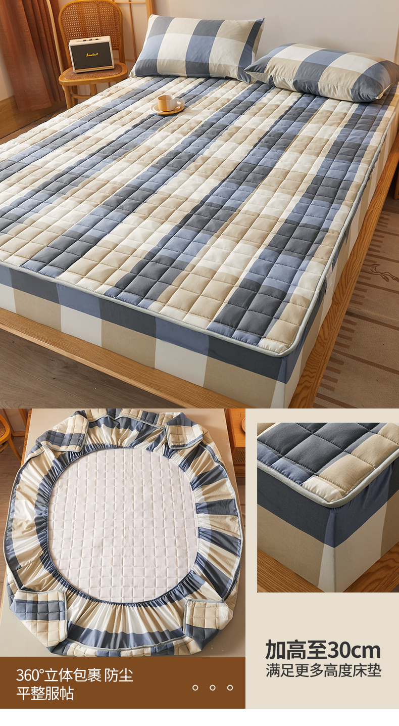 • 91家纺网 家纺一手货源 找家纺 胜权家纺 2024新款亲肤夹棉格子防水床笠 蓝大格