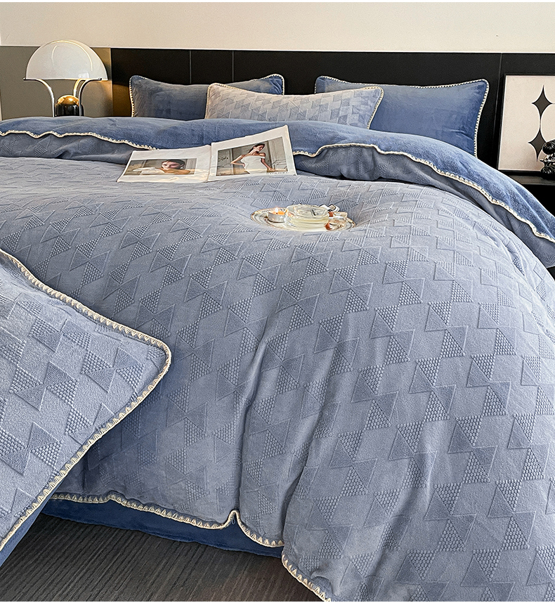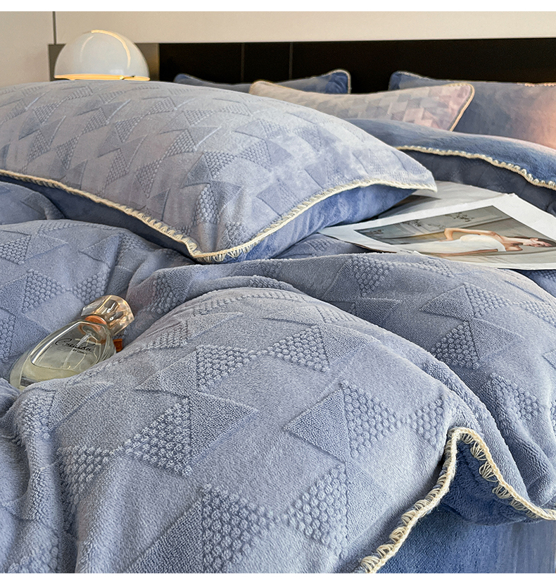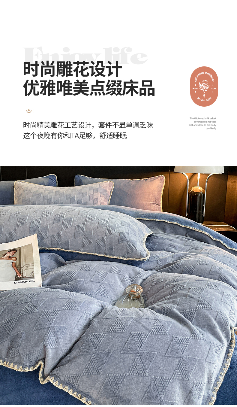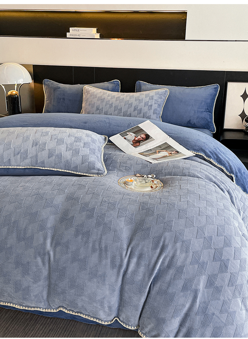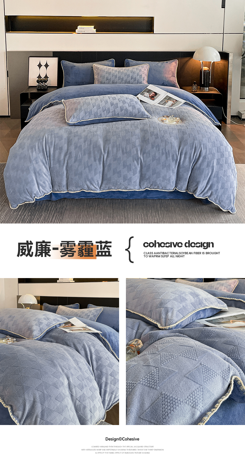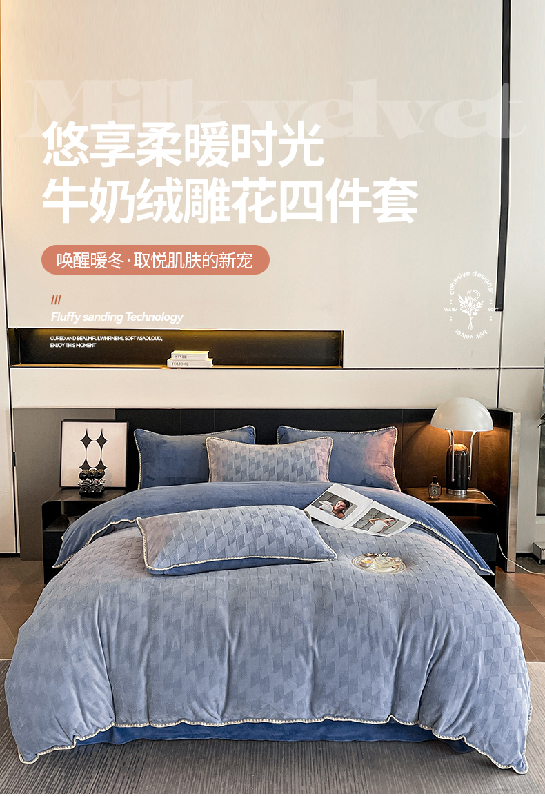 商品名称:澳梵 2023新款雕花牛奶绒贝壳边工艺四件套 威廉-雾霾蓝
