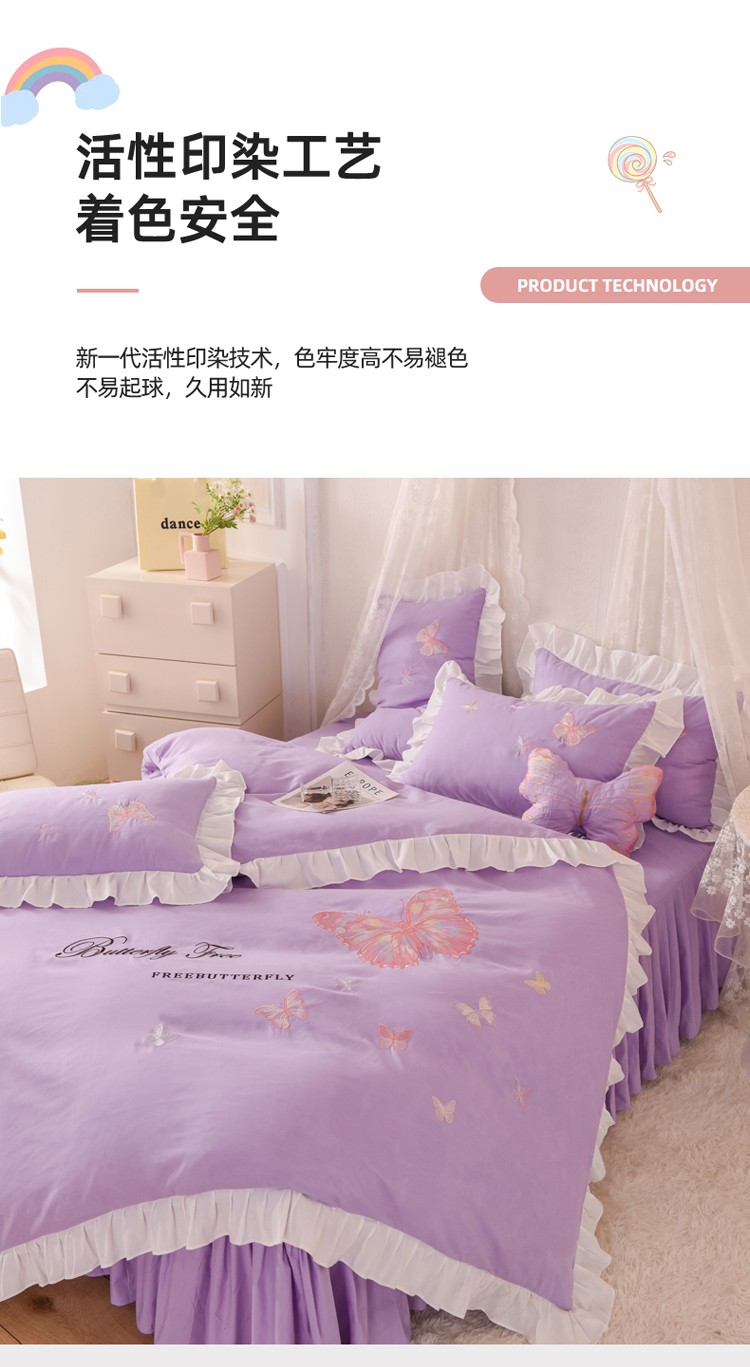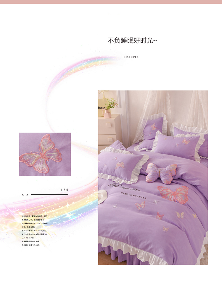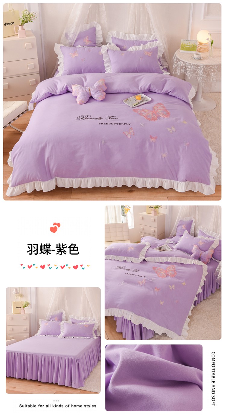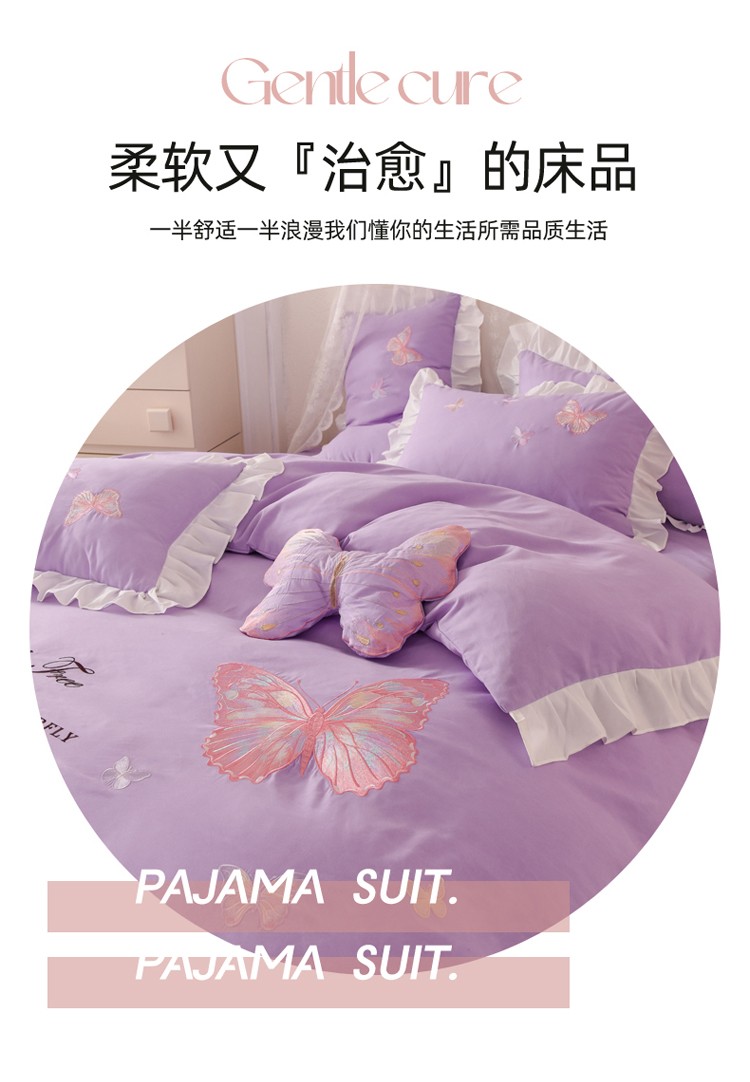 当前位置: 91家纺网 > 商品网购 > 床品套件 > 四件套 > 化纤普通四件套 > 欧冠 2023新款秋冬保暖云锦棉刺绣花边羽蝶系列四件套 羽蝶-紫色