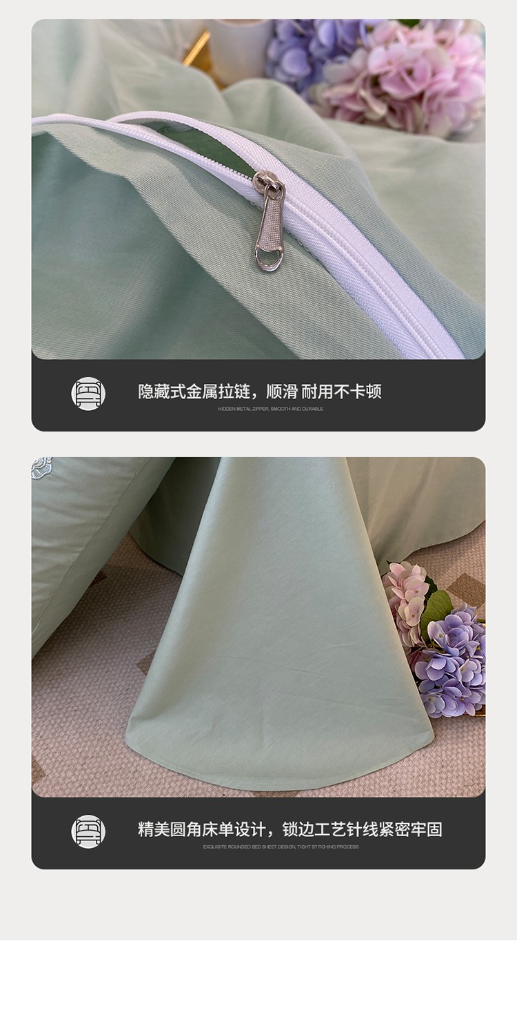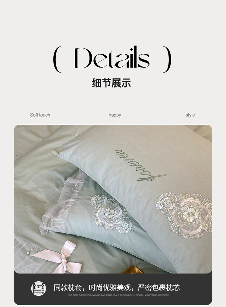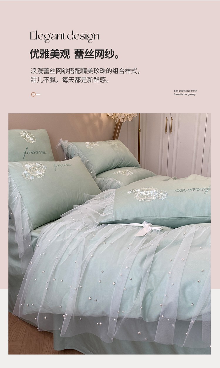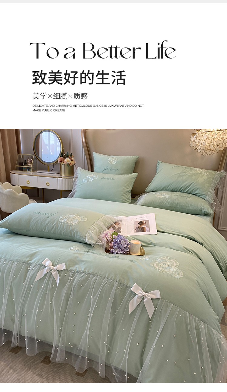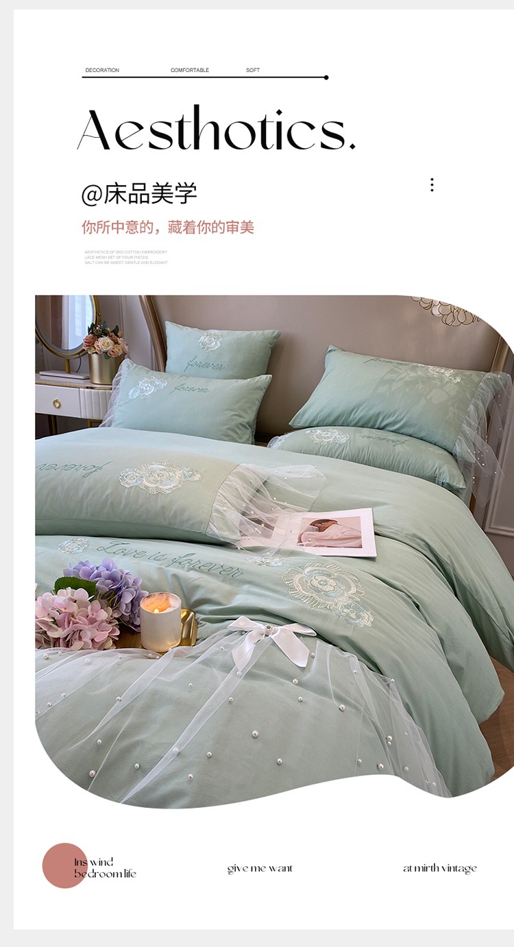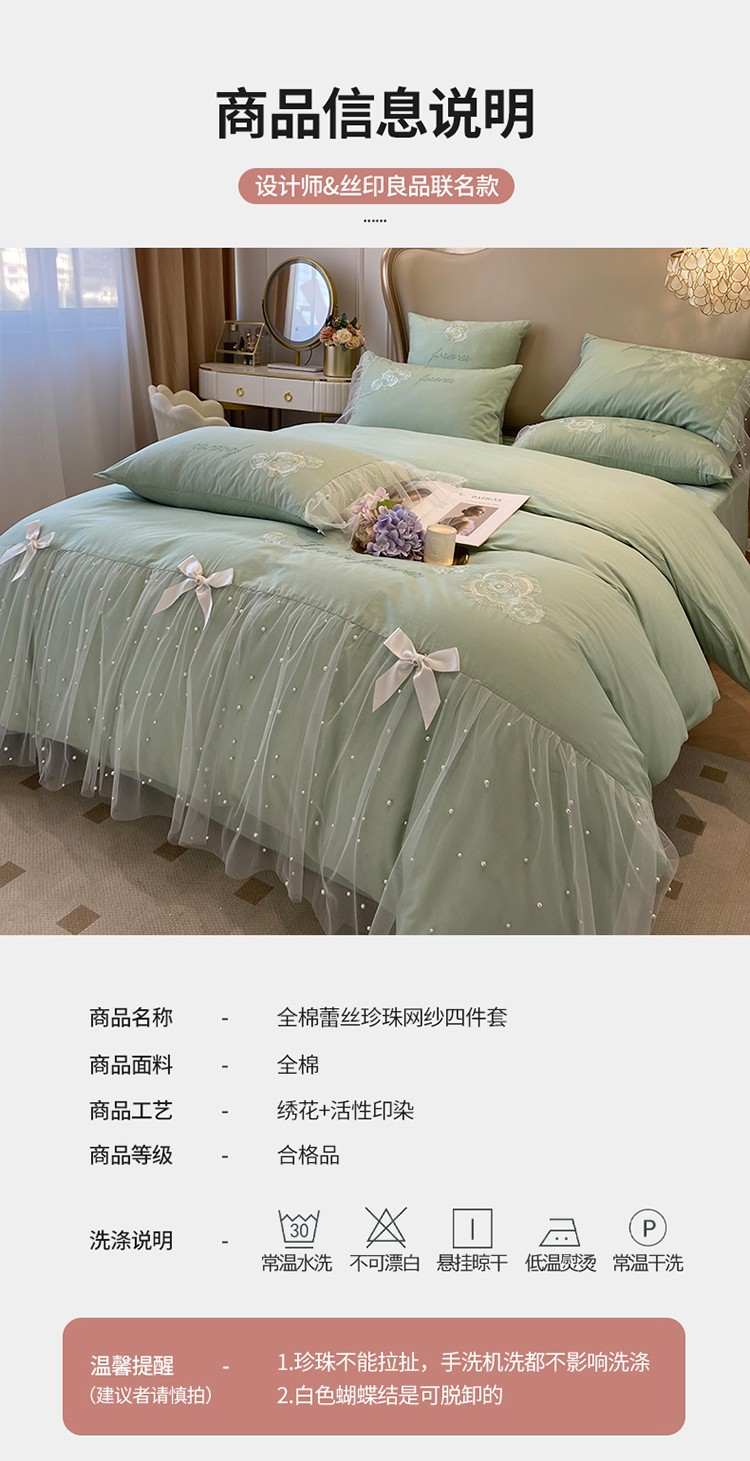 商品名称:欧冠 2023新款秋冬保暖60S全棉蕾丝刺绣丽丽贝尔系列四件套 青柠抹茶