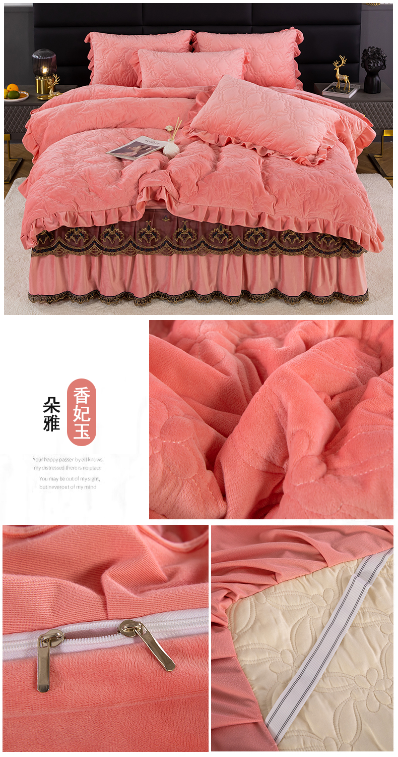 (总)2025新款纯色雕花全消光牛奶绒蕾丝绣花被套夹棉床裙 床盖款四件套(控价268),粉玉,米咖,天蓝,香芋紫,淡紫,豆纱色