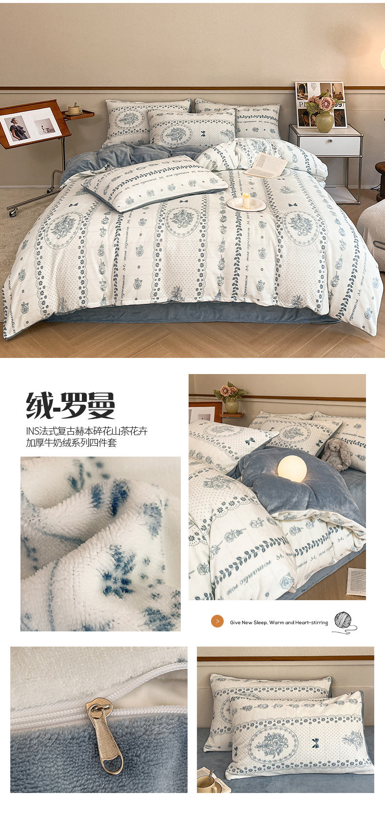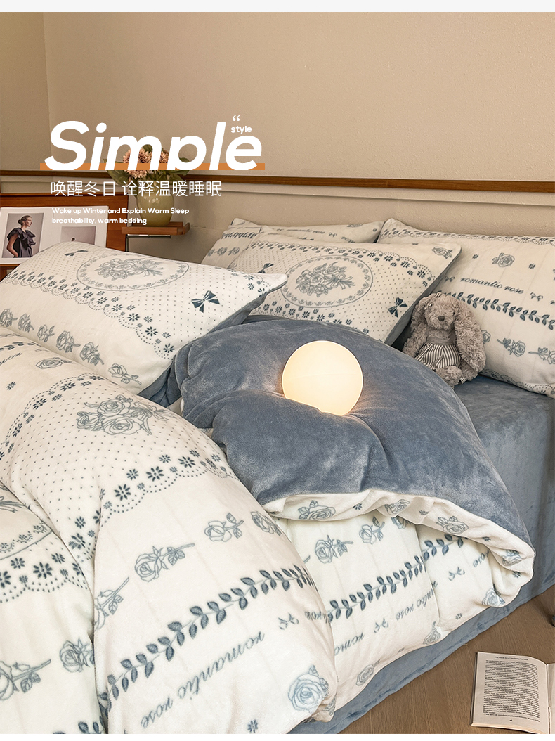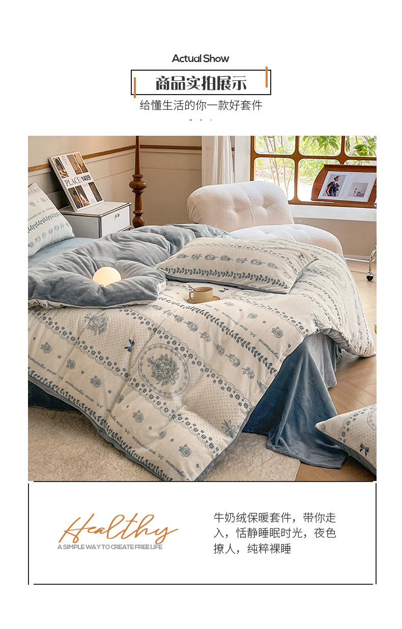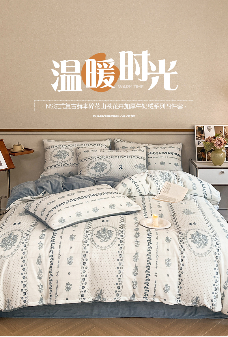 桃子家居 2023新款ins法式复古赫本碎花山茶花卉加厚牛奶绒系列四件套 绒-罗曼