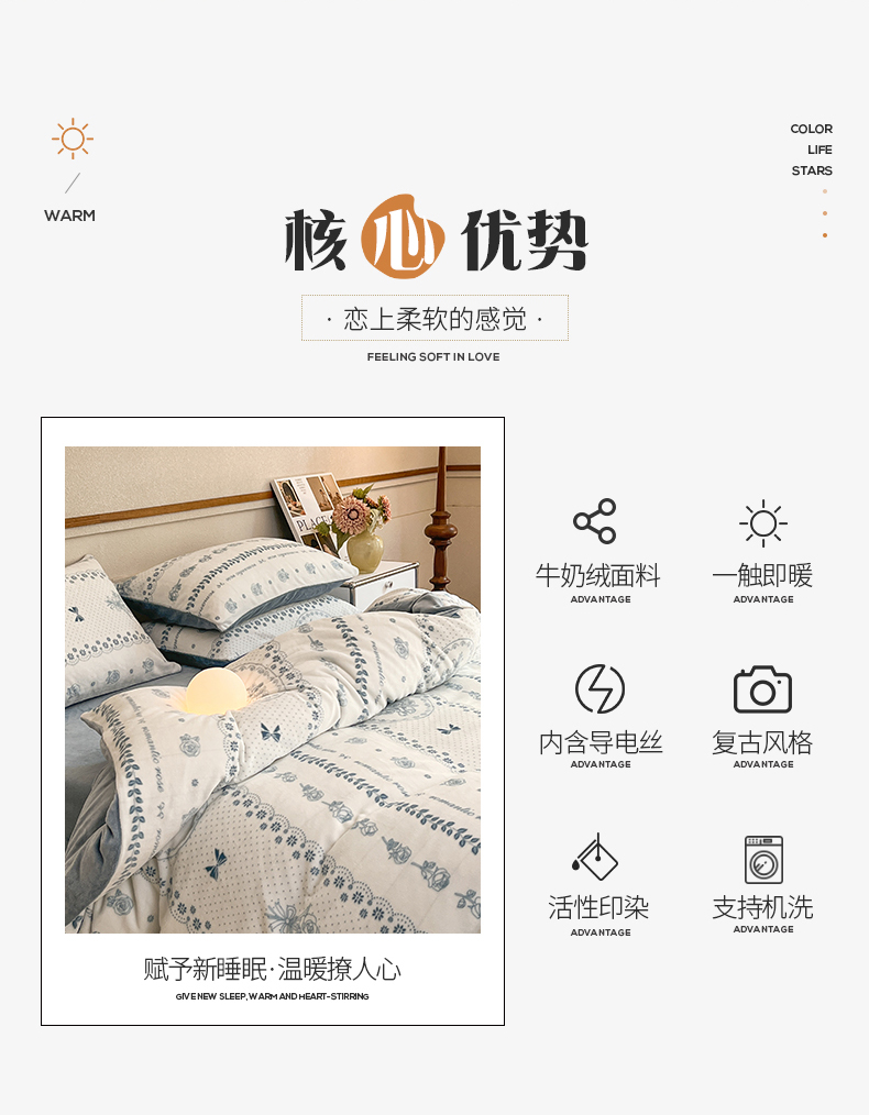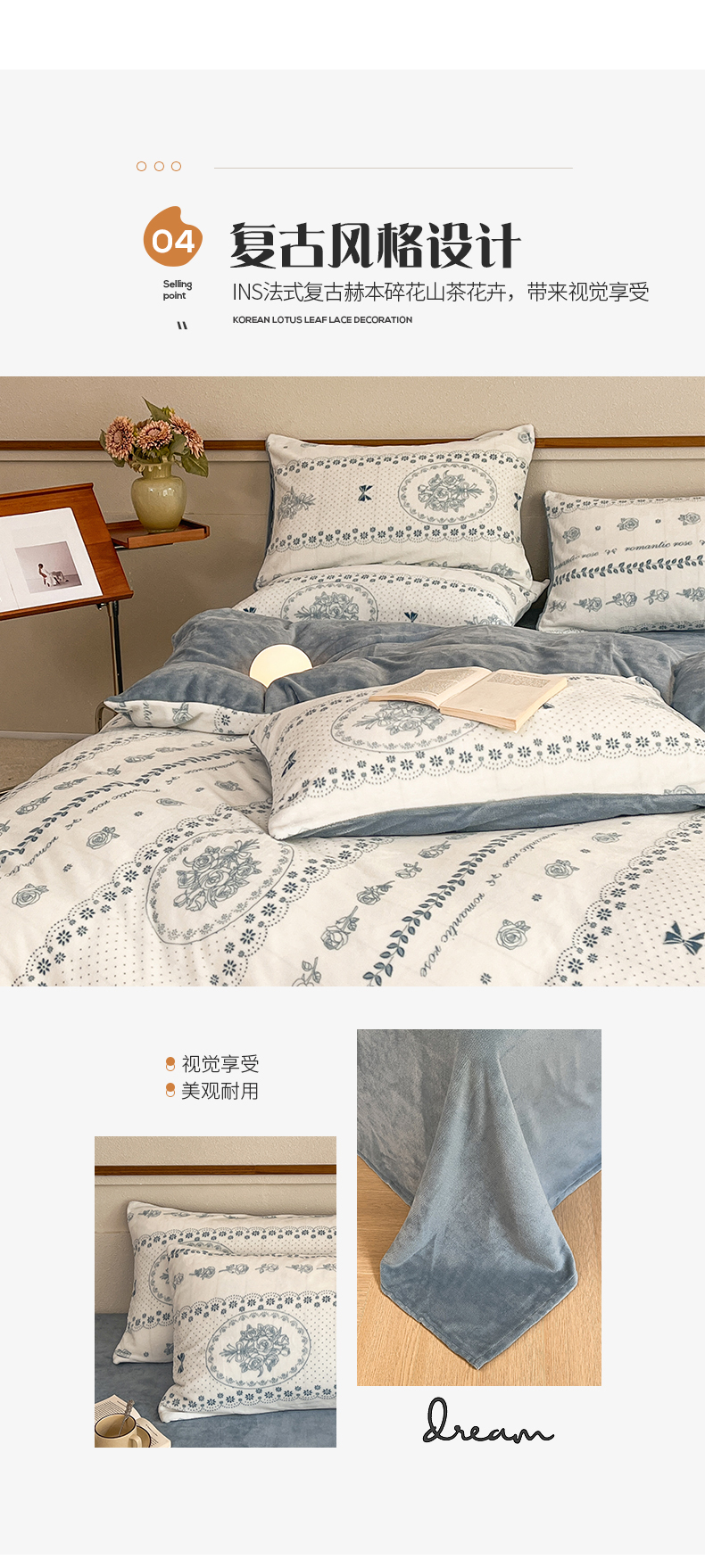 商品名称:桃子家居 2023新款ins法式复古赫本碎花山茶花卉加厚牛奶绒系列四件套 绒-罗曼