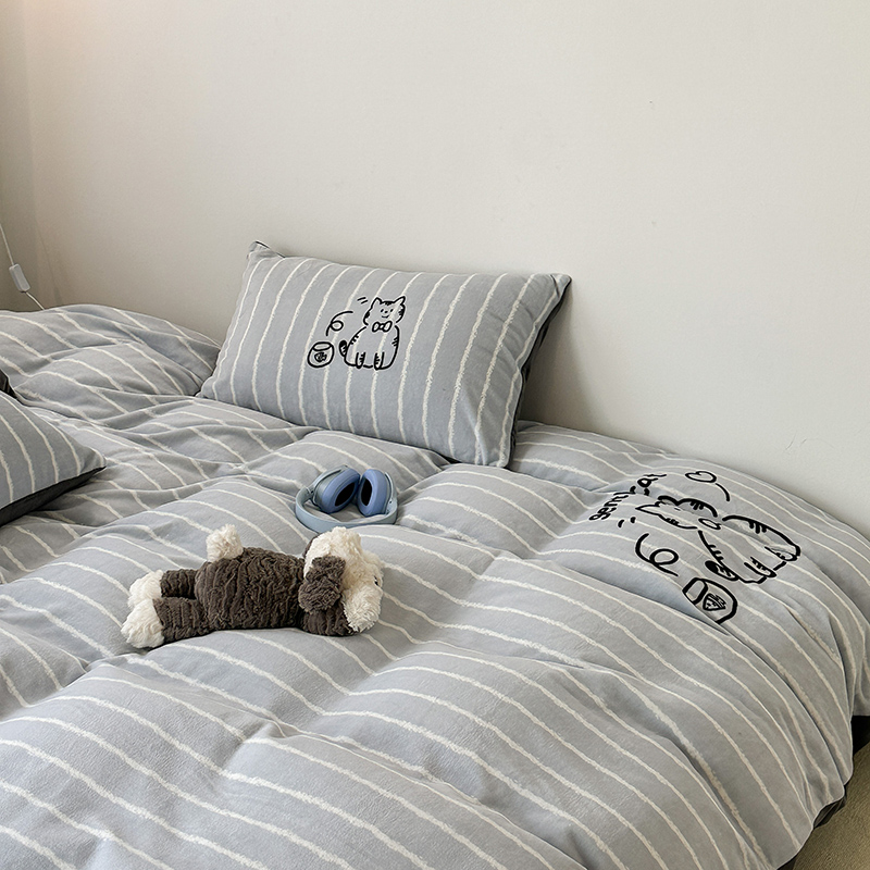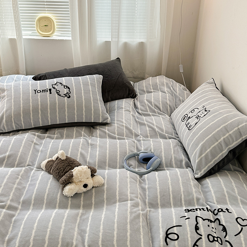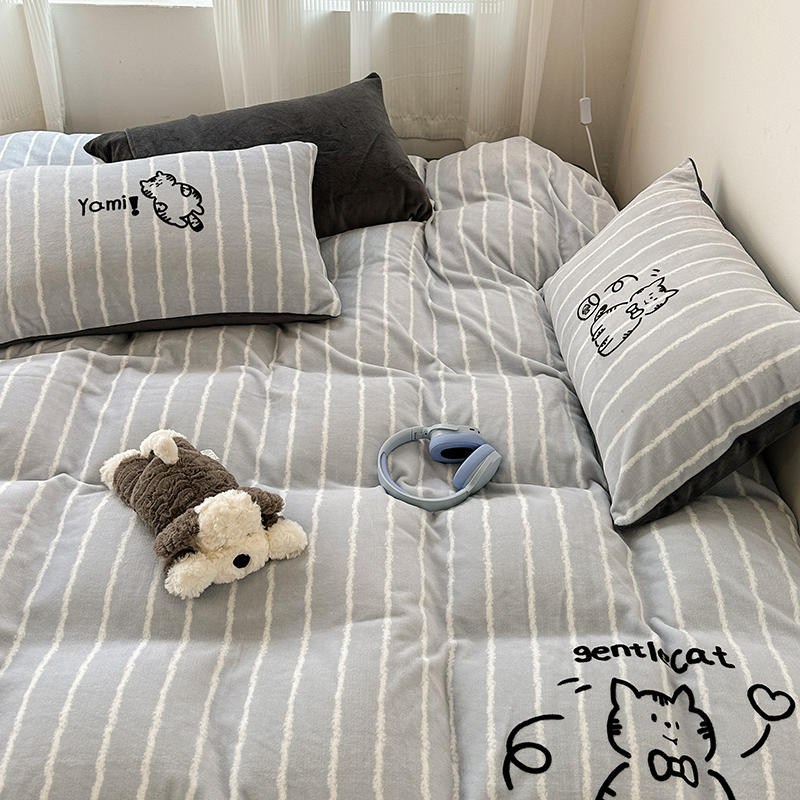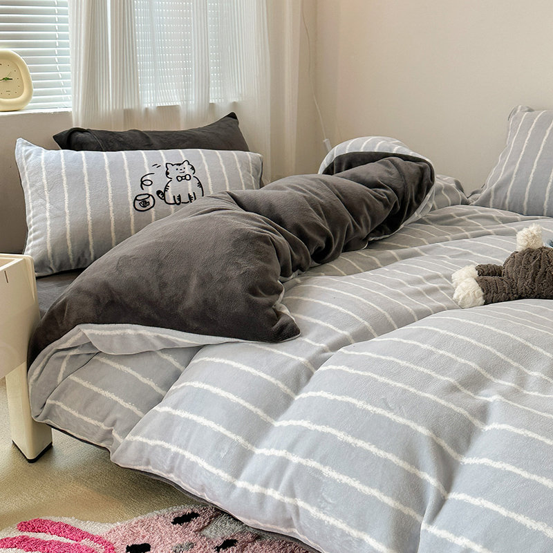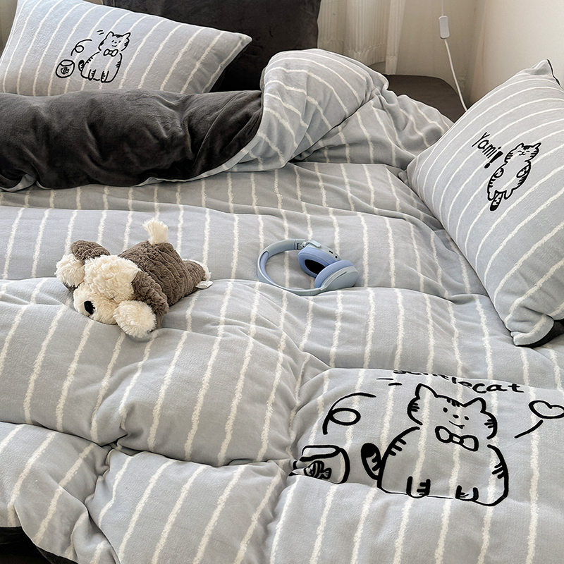 商品名称:昔可家纺 2023新款大版数码印花保暖牛奶绒四件套 灰条绅士猫