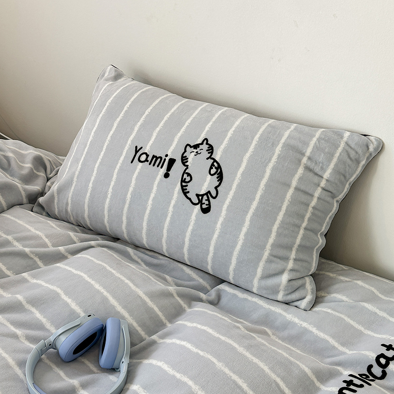 昔可家纺 2023新款大版数码印花保暖牛奶绒四件套 灰条绅士猫