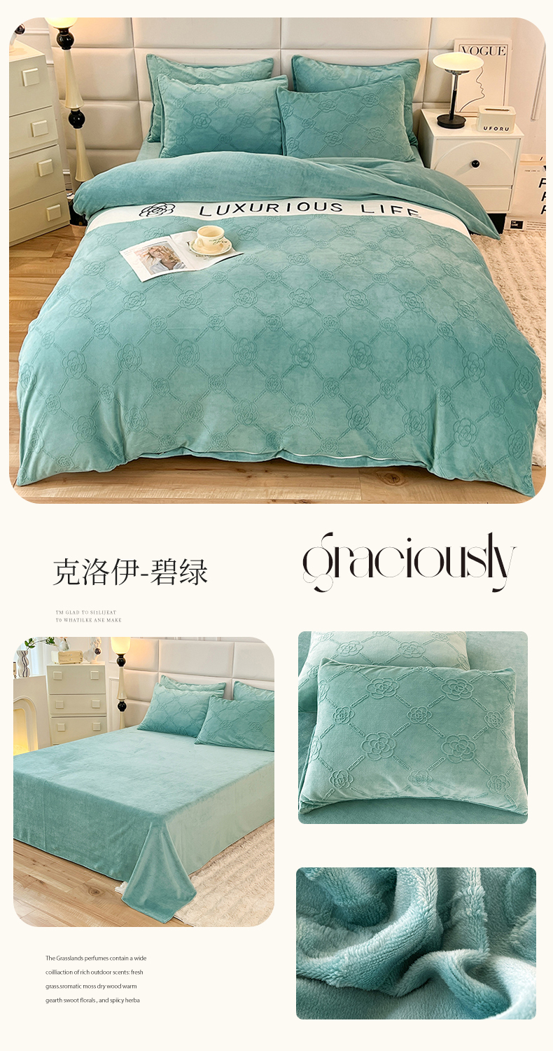 商品名称:绒兔兔 2023新款雕花烂花牛奶绒刺绣四件套 克洛伊系列 克洛伊-碧绿