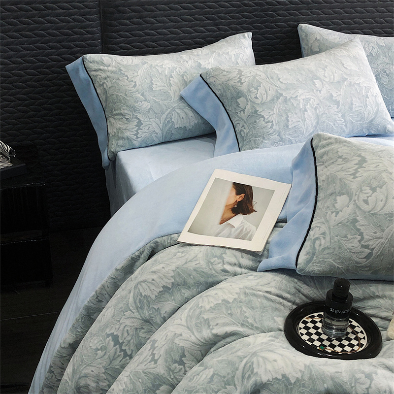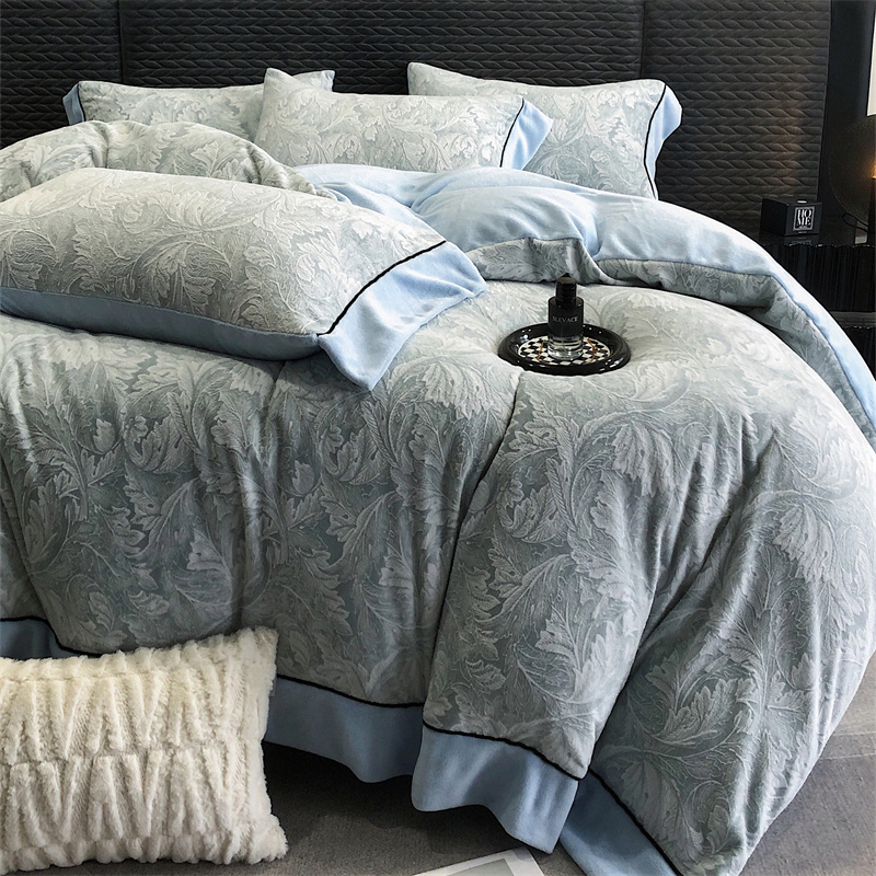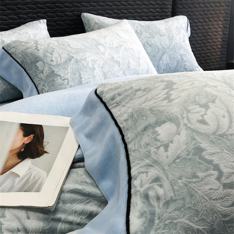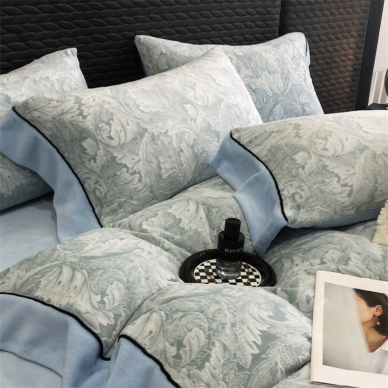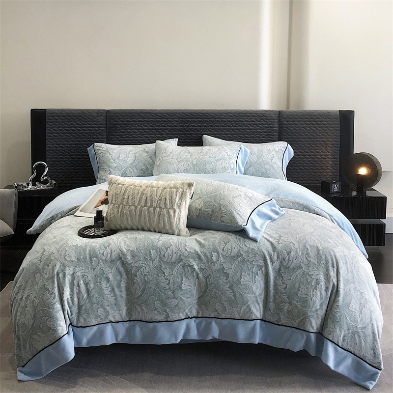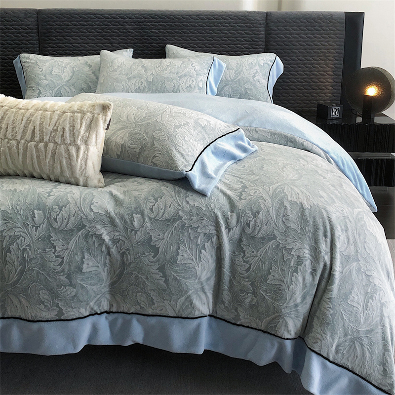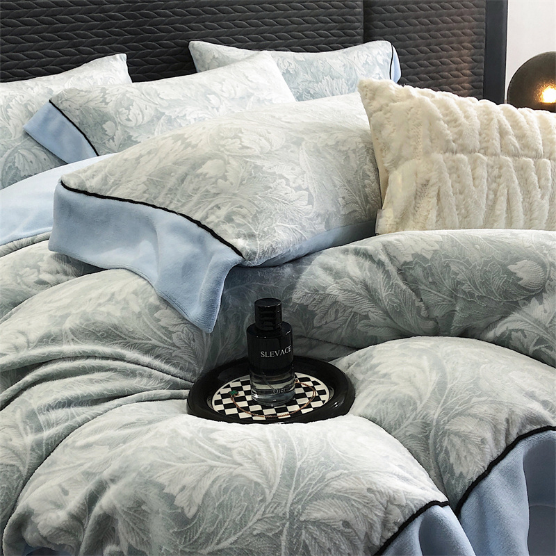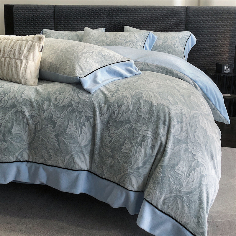 商品名称:博纳家纺 2023新款牛奶绒宽边四件套嵌绳系列 枝叶-蓝