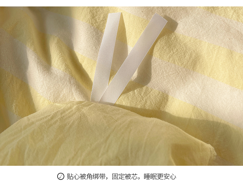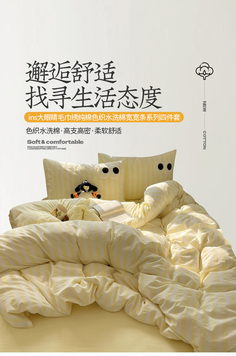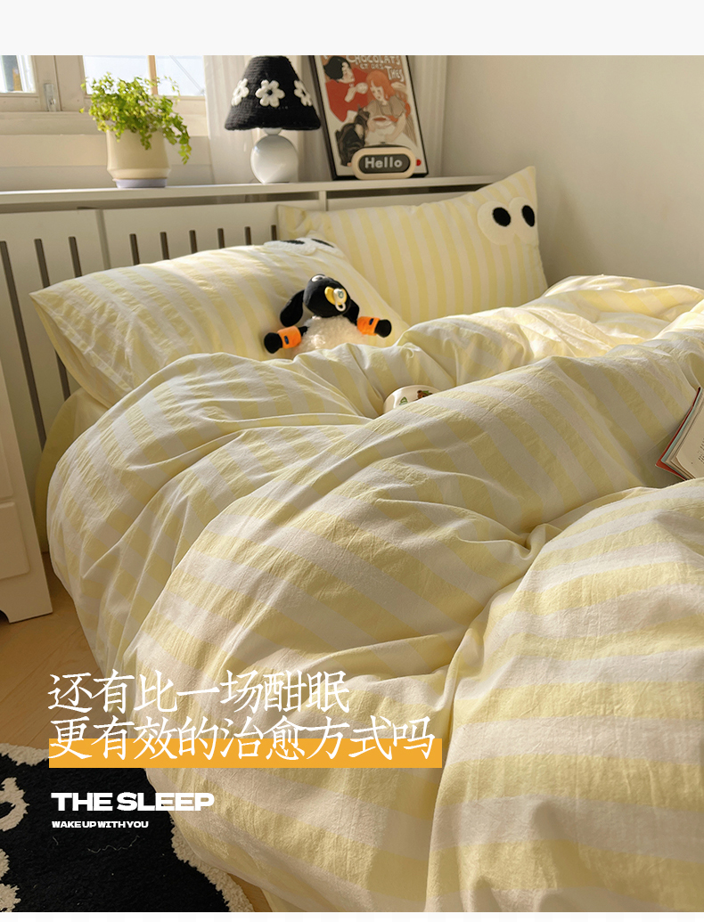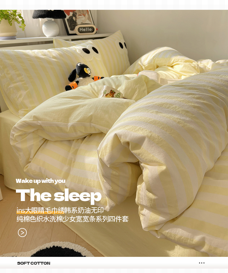商品名称:桃子 2024新款ins大眼睛毛巾绣韩系奶油无印纯棉色织水洗棉少女宽宽条系列四件套 水洗棉-宽宽条黄