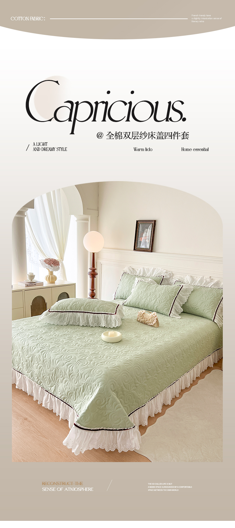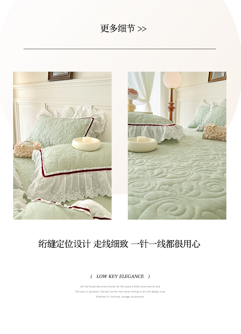 商品名称:麒豆豆 2024新款全棉双层纱花边款爱丽丝系列单床盖 豆蔻绿