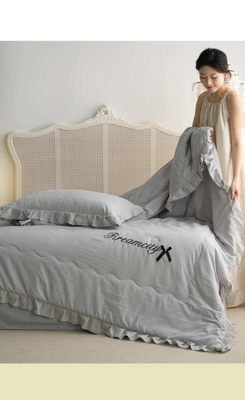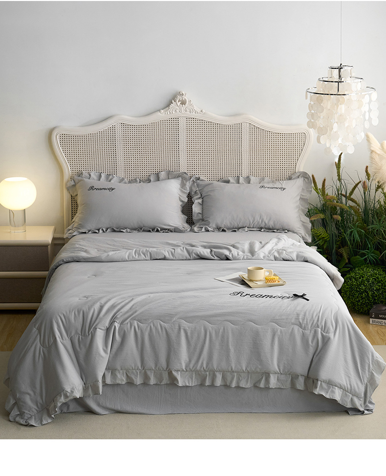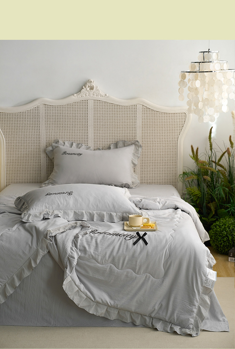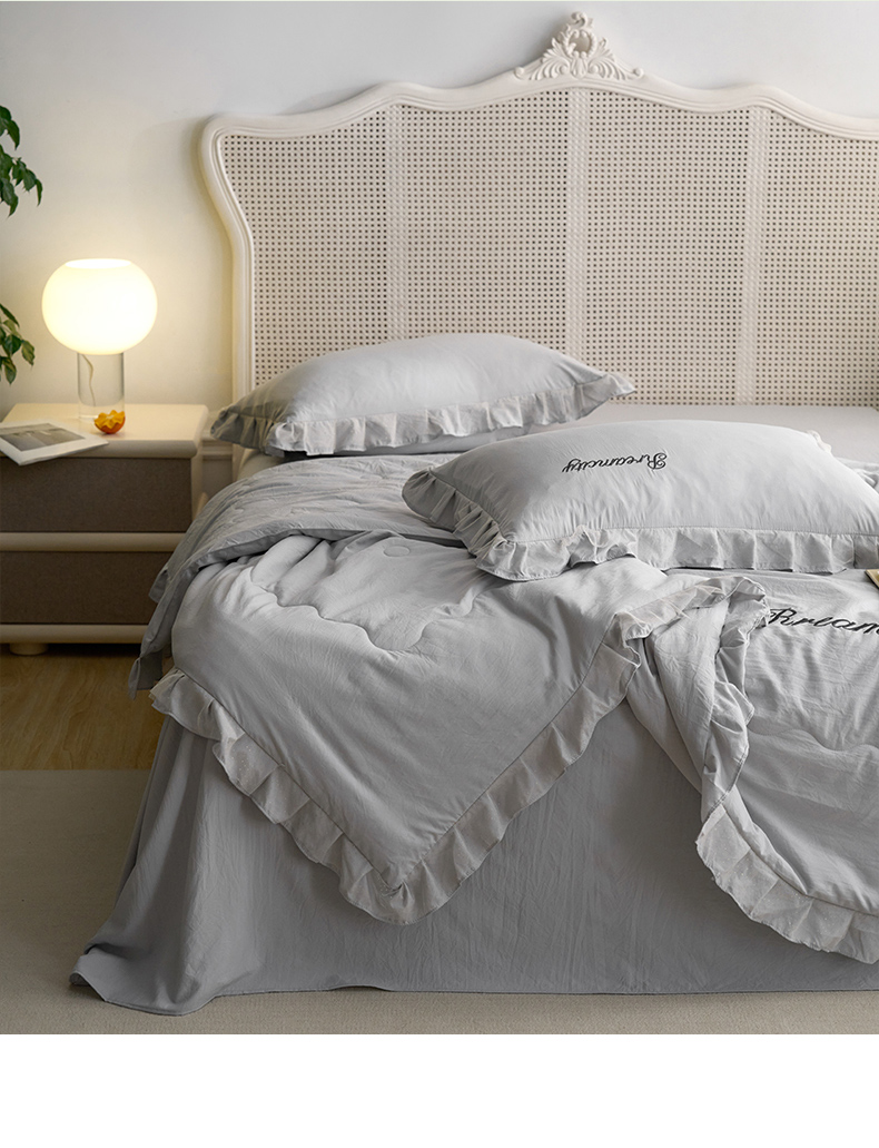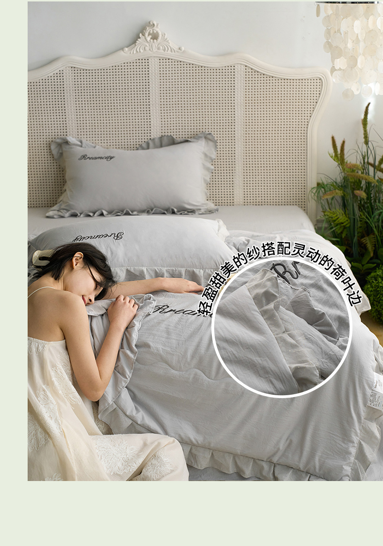商品名称:(总)嗯呢2025新款A类倍柔棉双层花边绣花夏被四件套 溶月灰