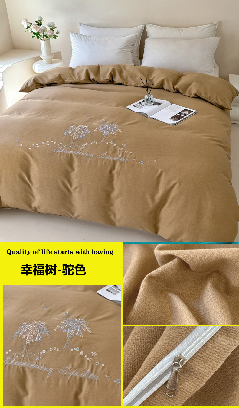 • 91家纺网 家纺一手货源 找家纺 艾迪尚家纺 2025新款纯色生态磨毛绣花单被套 幸福树-驼色