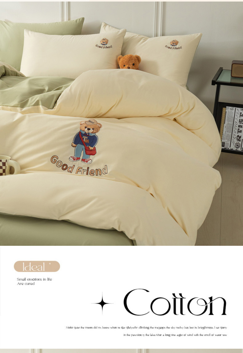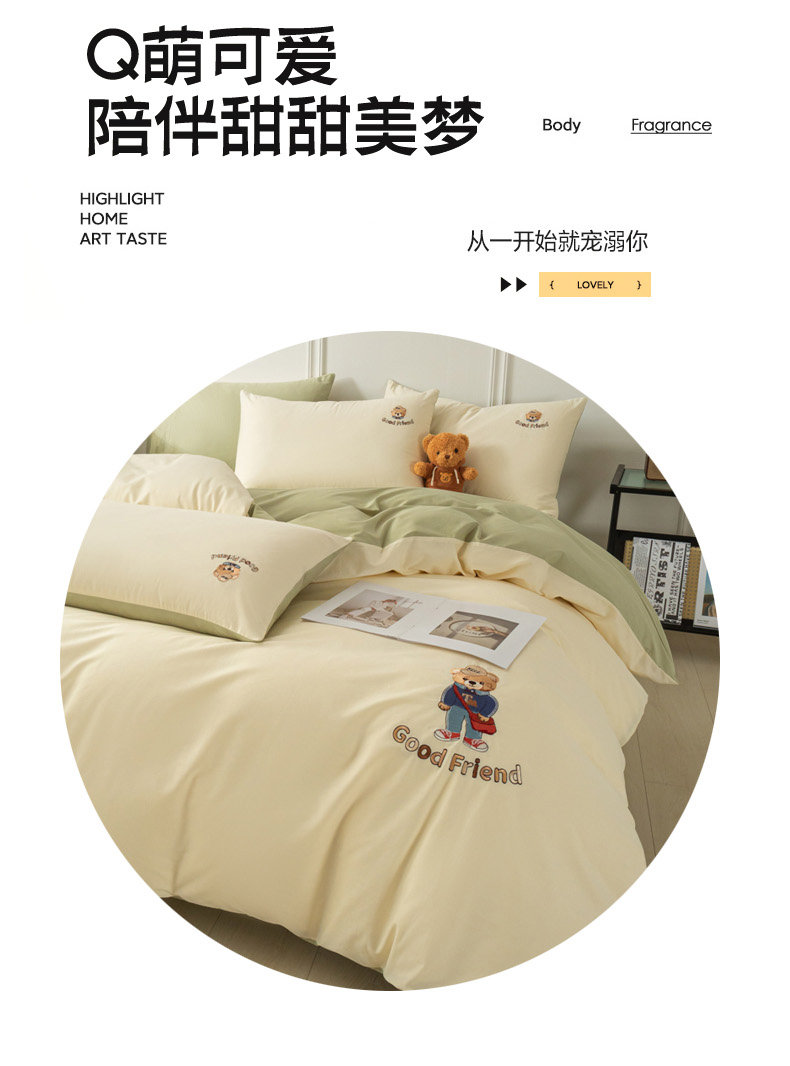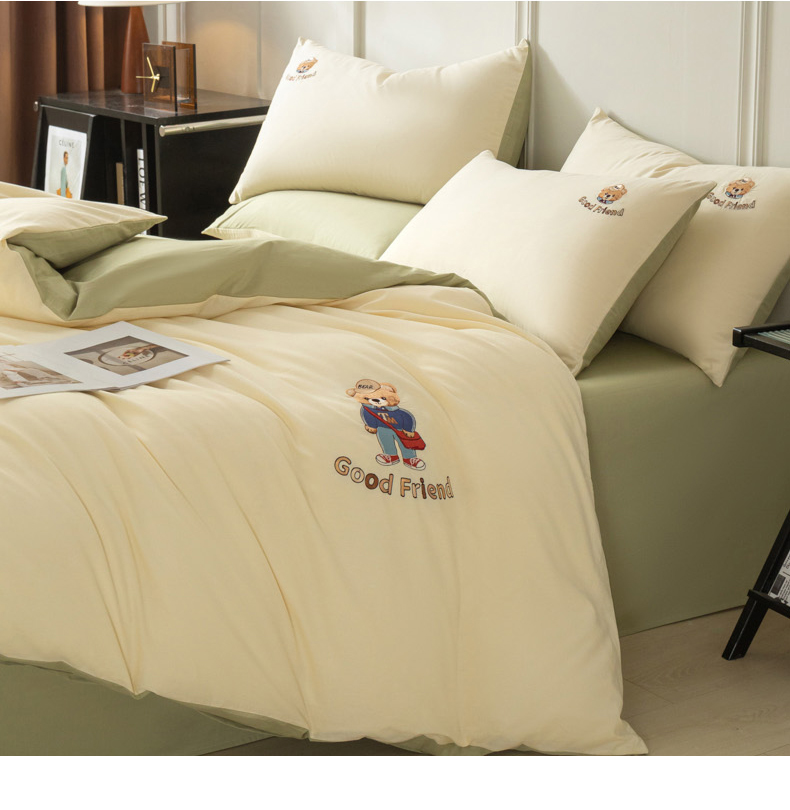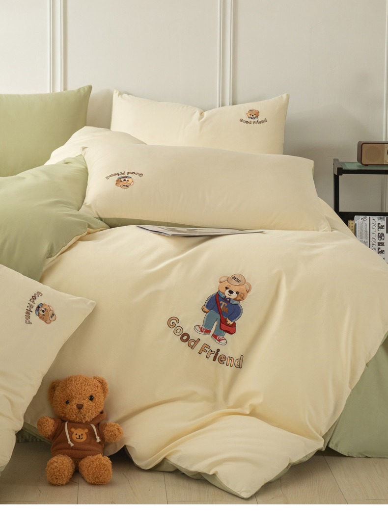 当前位置: 91家纺网 > 商品网购 > 床品套件 > 四件套 > 全棉活性四件套 > 万盛家纺 2025新款全棉喷气13372刺绣卡通四件套 fashion熊-奶白绿