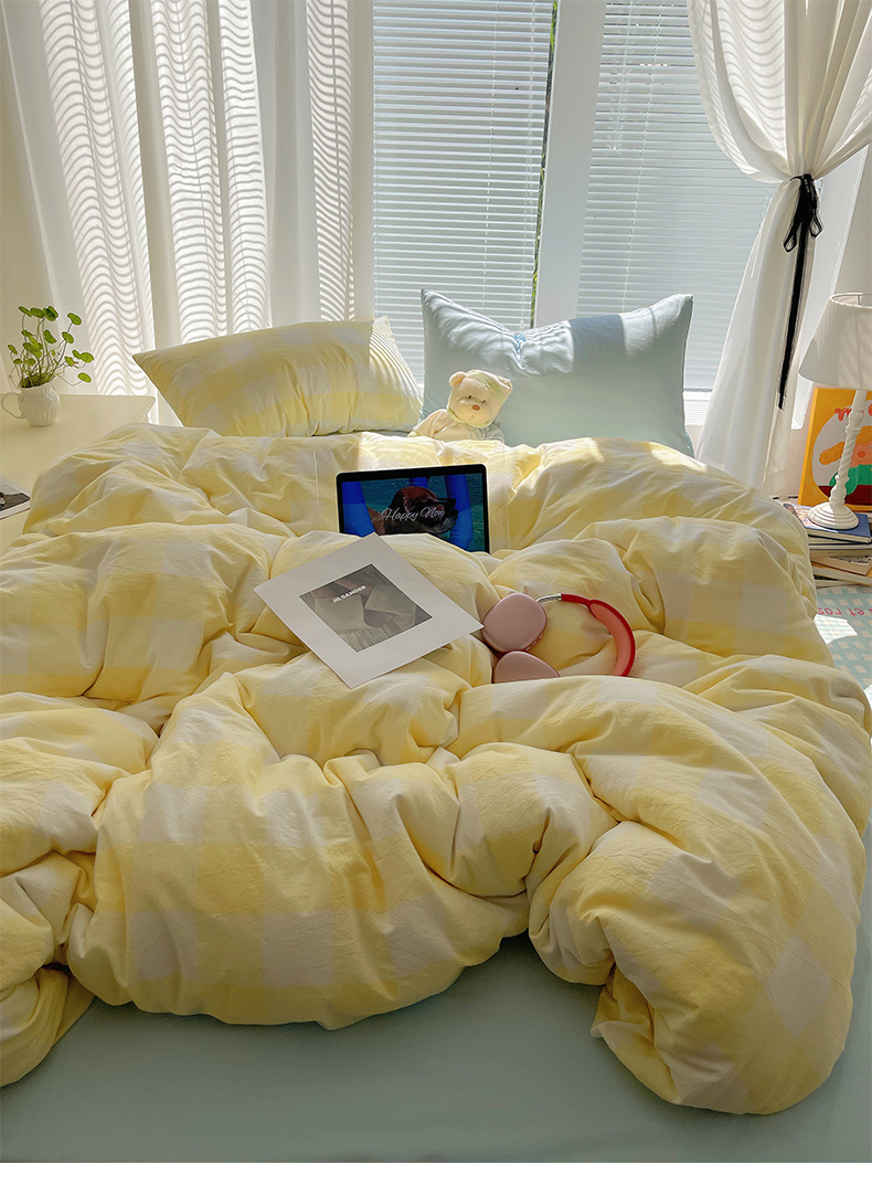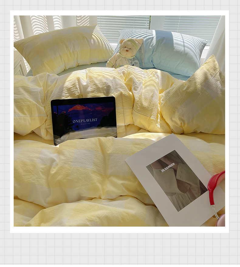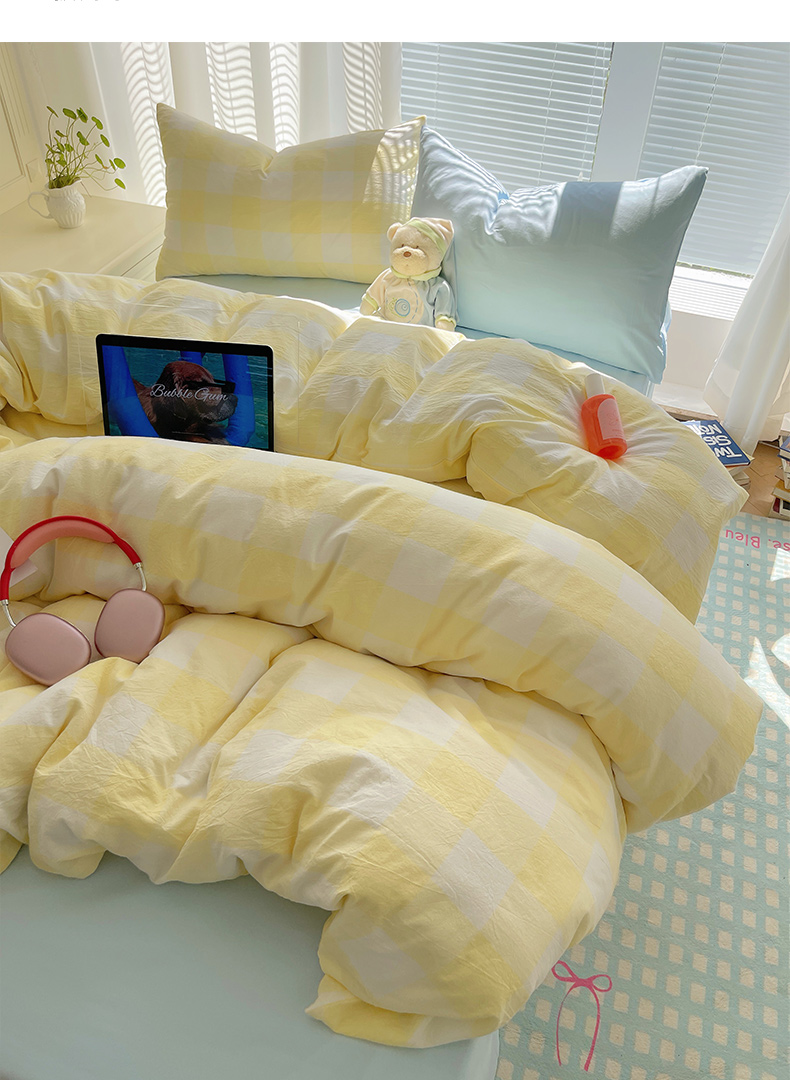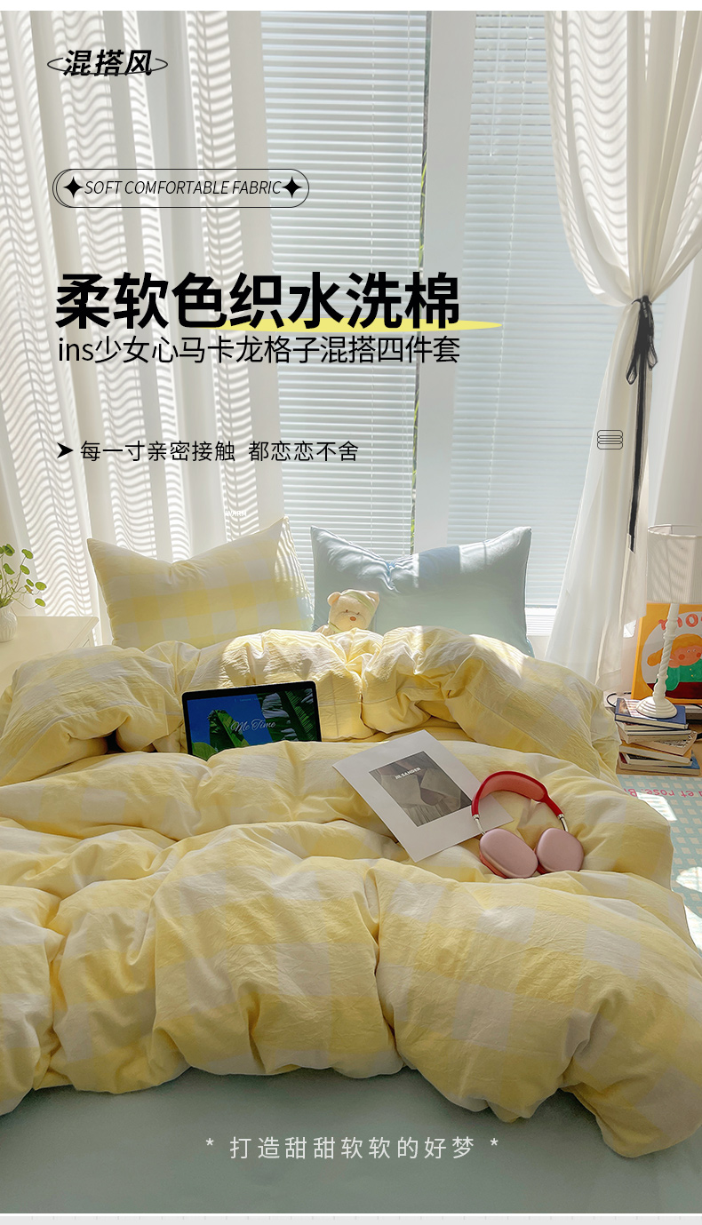 当前位置: 91家纺网 > 商品网购 > 床品套件 > 四件套 > 全棉普通四件套 > 六巷胡同 2024新款全棉INS少女心马卡龙格子混搭四件套 混搭柠檬黄大格