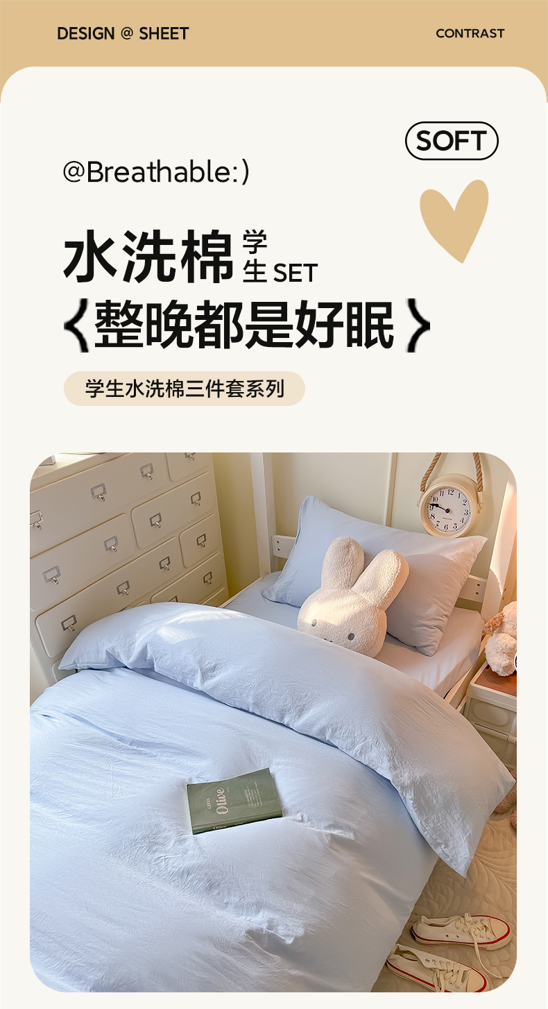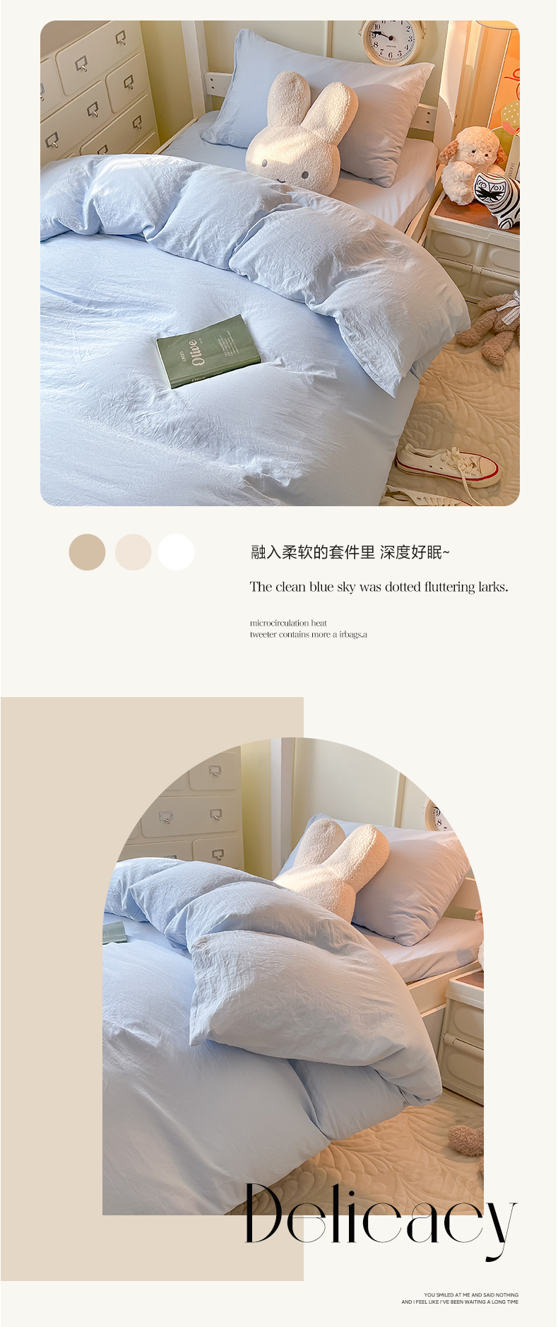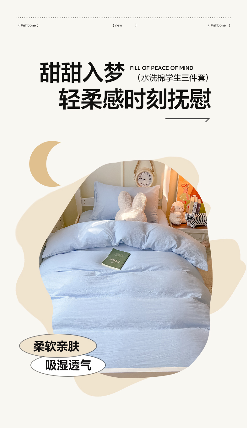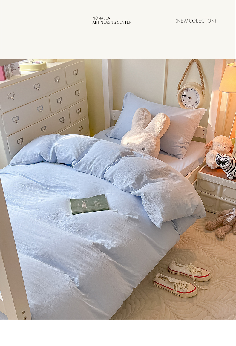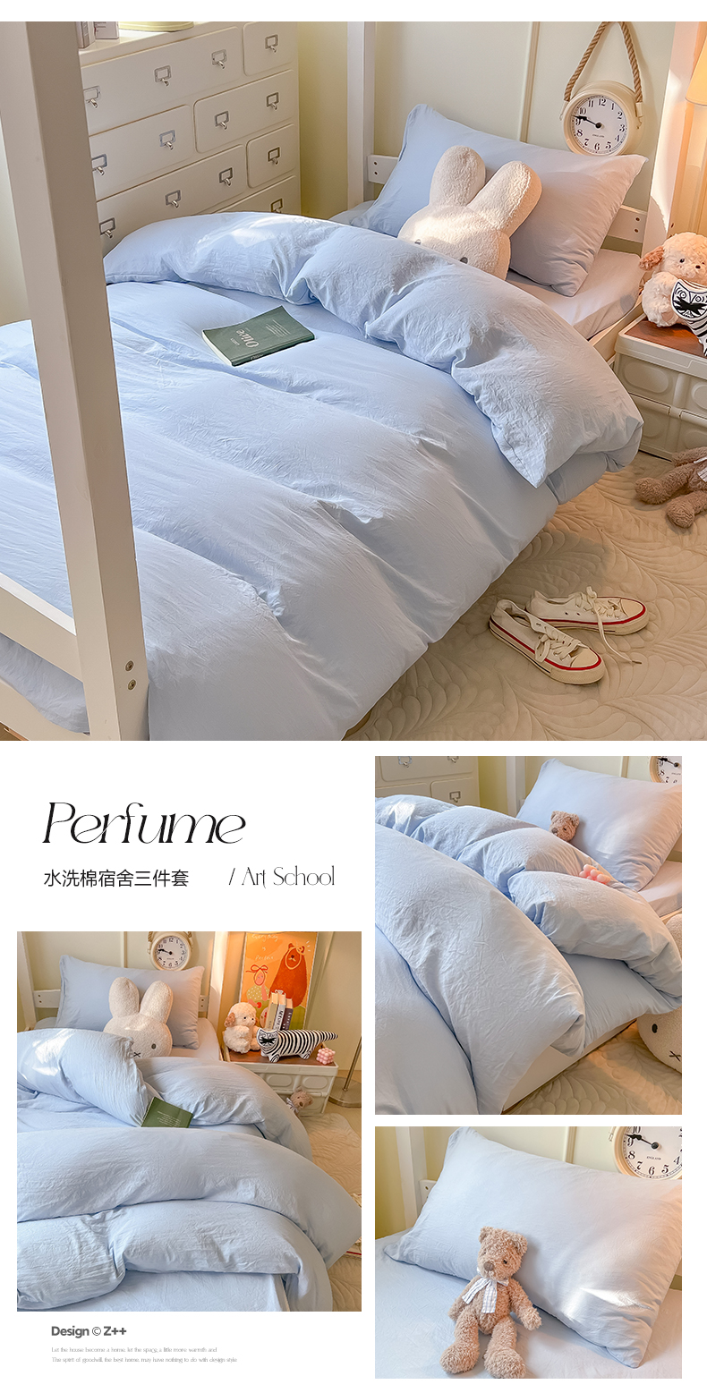 当前位置: 91家纺网 > 商品网购 > 床品套件 > 三件套 > 韩巢家纺 2024新款学生宿舍员工寝室上下铺超柔水洗棉床单被套三件套-纯色系列拼(提供卖家秀) 水洗棉浅蓝