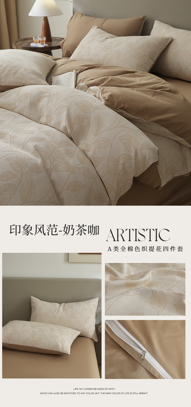 当前位置: 91家纺网 > 商品网购 > 床品套件 > 四件套 > 全棉普通四件套 > 慕色家纺 2024新款A类全棉色织提花四件套系列 印象风范-奶茶咖