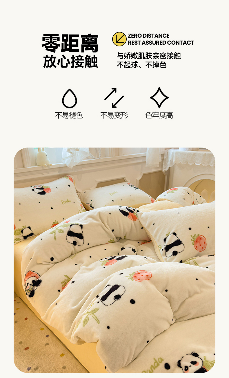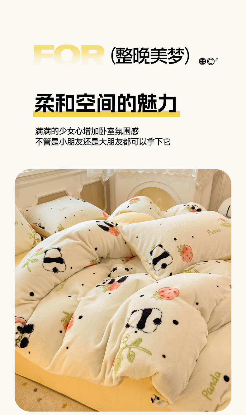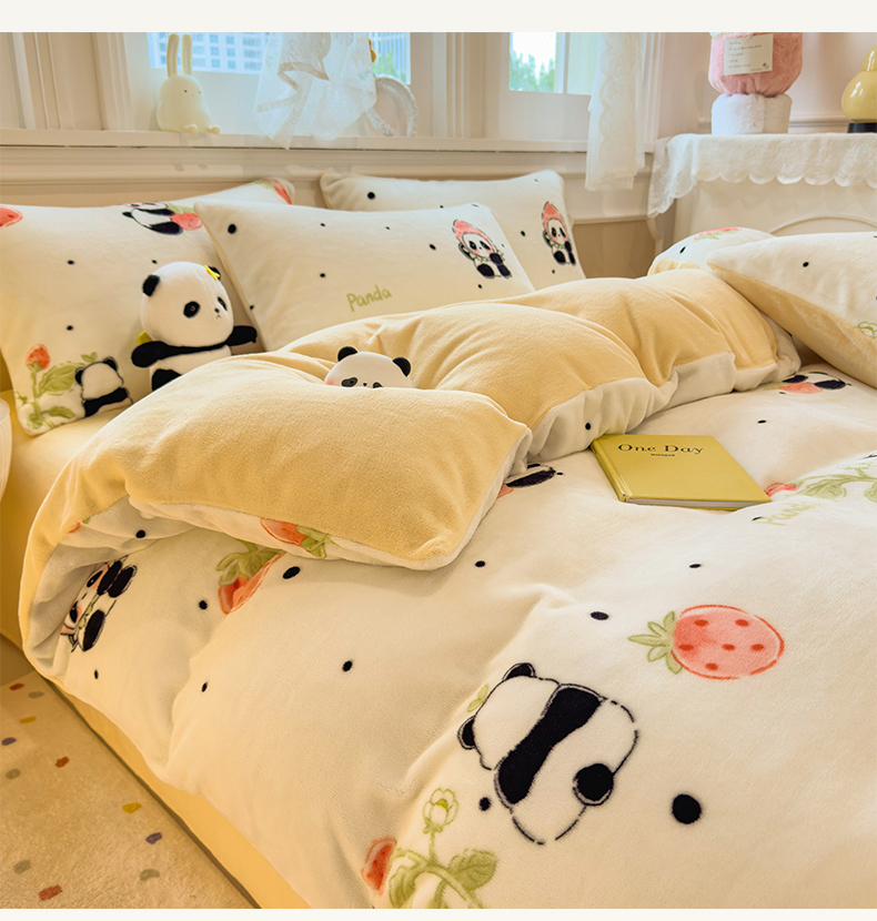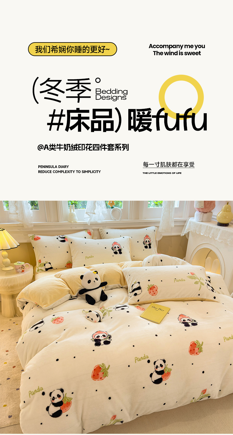 当前位置: 91家纺网 > 商品网购 > 床品套件 > 四件套 > 牛奶绒四件套 > 摩妮卡 2025新款小清新牛奶绒印花四件套床单款床笠单被套-场景1 草莓熊猫