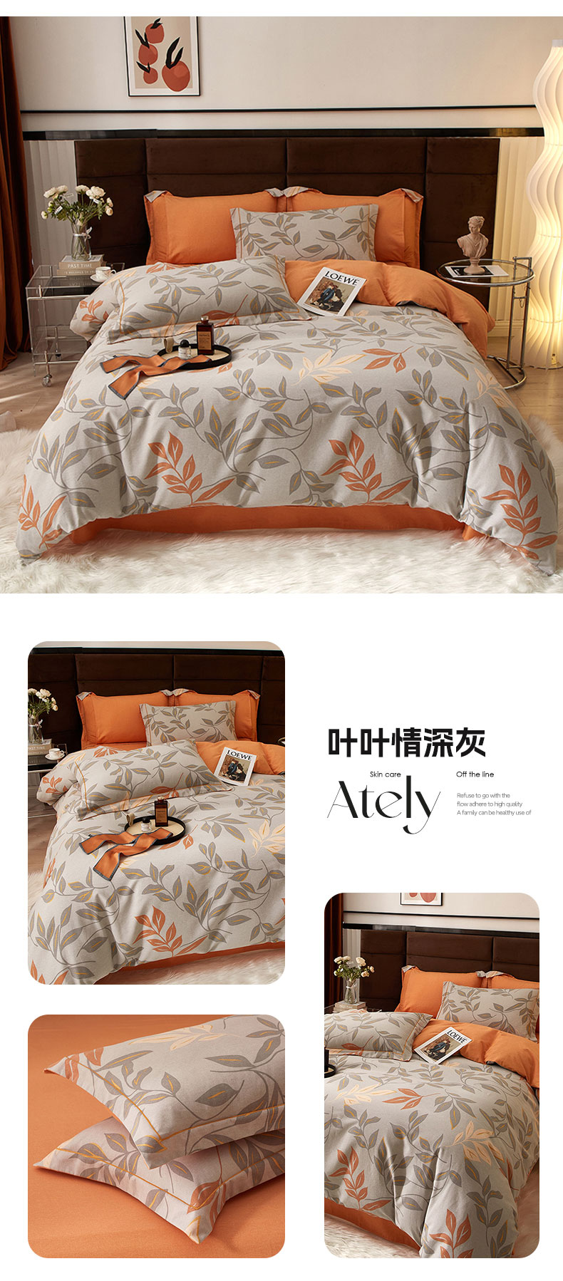 2025新款全棉精梳磨毛印花四件套 叶叶情深灰