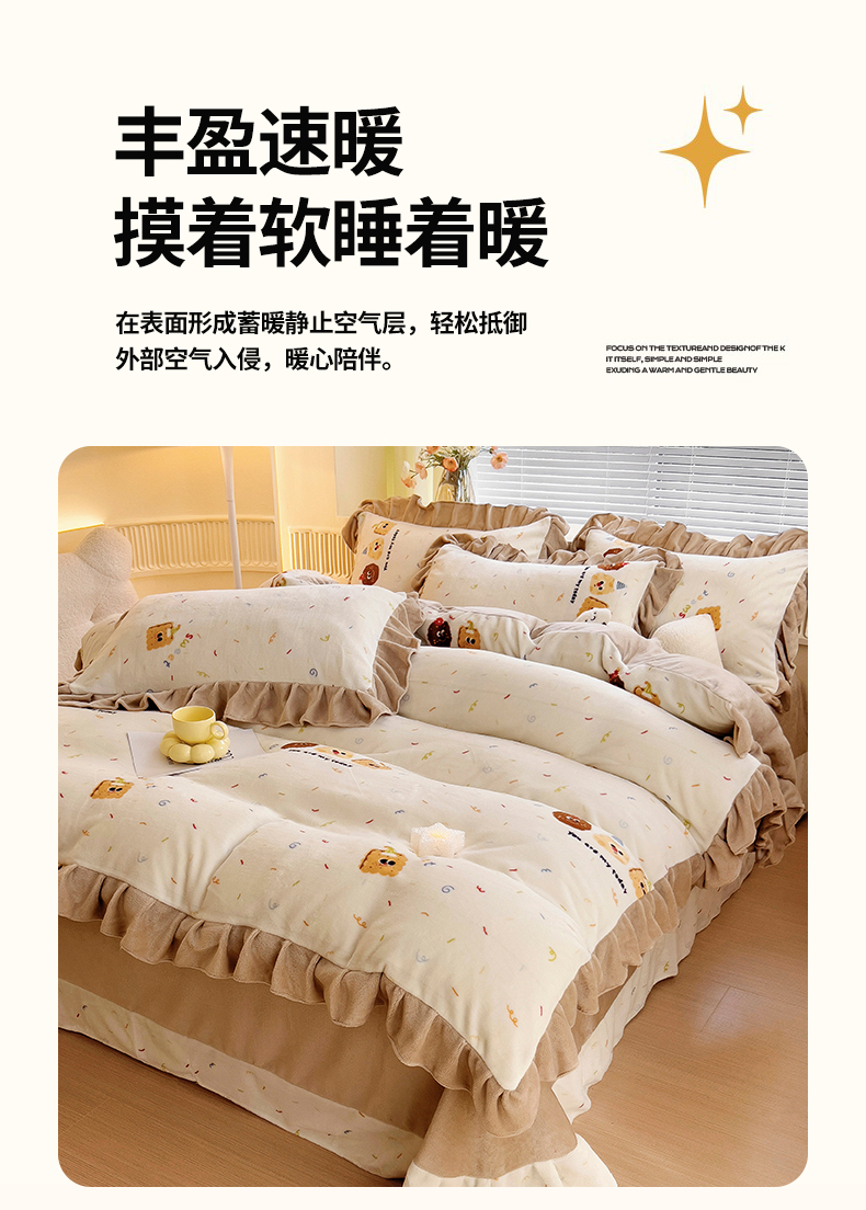 (总)找底底家纺 2025新款花边9-10斤牛奶绒床盖款四件套,花妖,梨花落,小樱桃,紫蔻