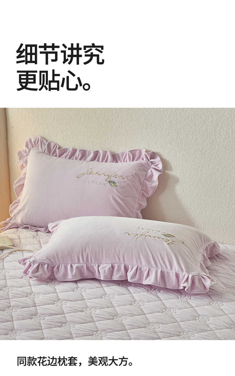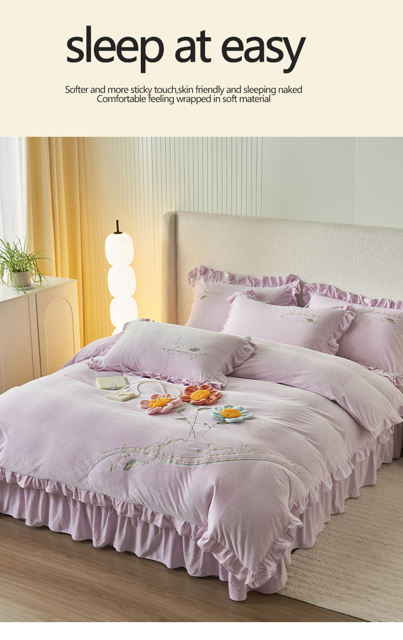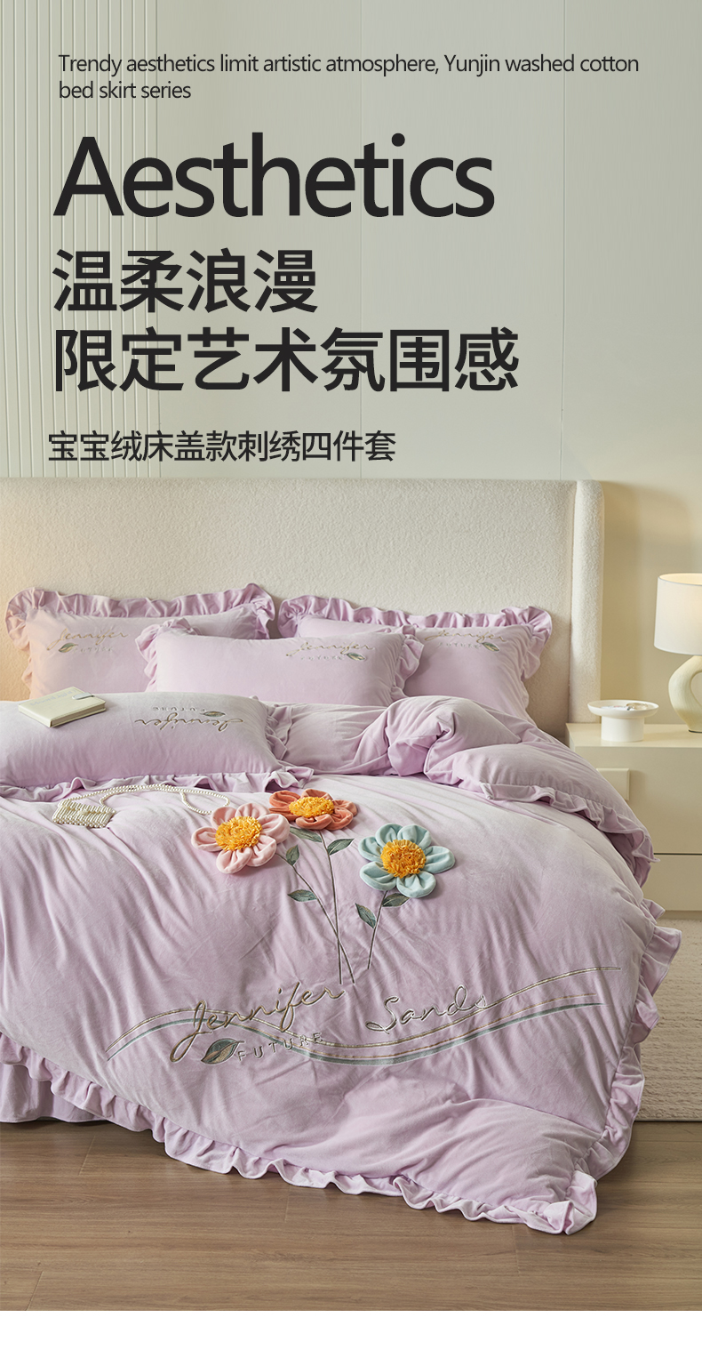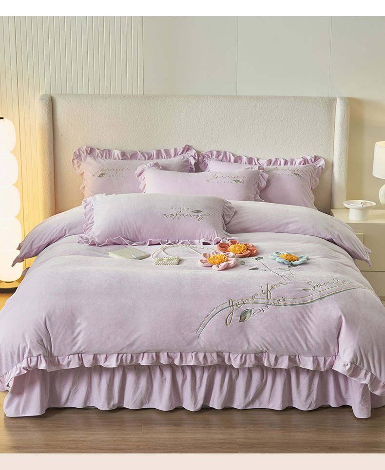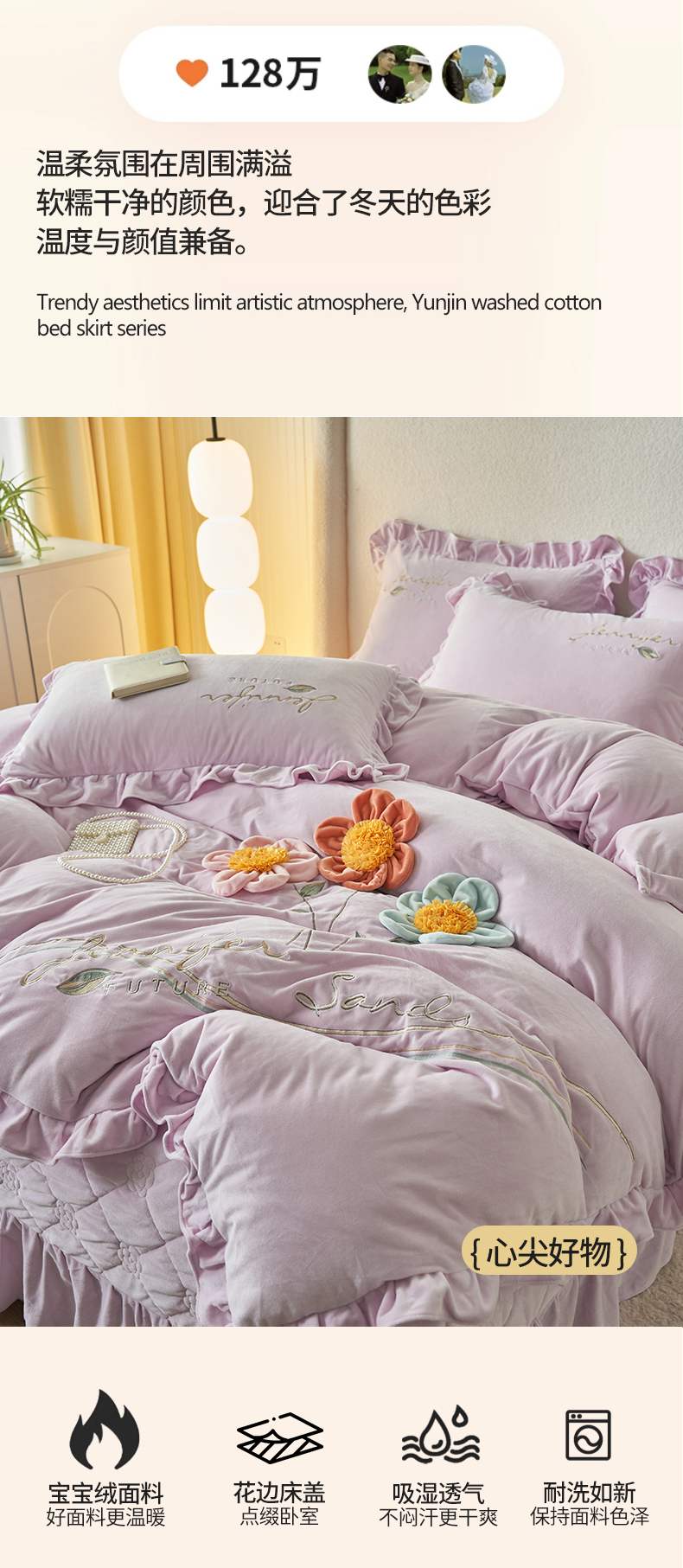 (总)恒爱家纺 2025新款牛奶绒贴布绣夹棉床裙四件套,豆沙红,浪漫紫,天空蓝,温馨粉,象牙白