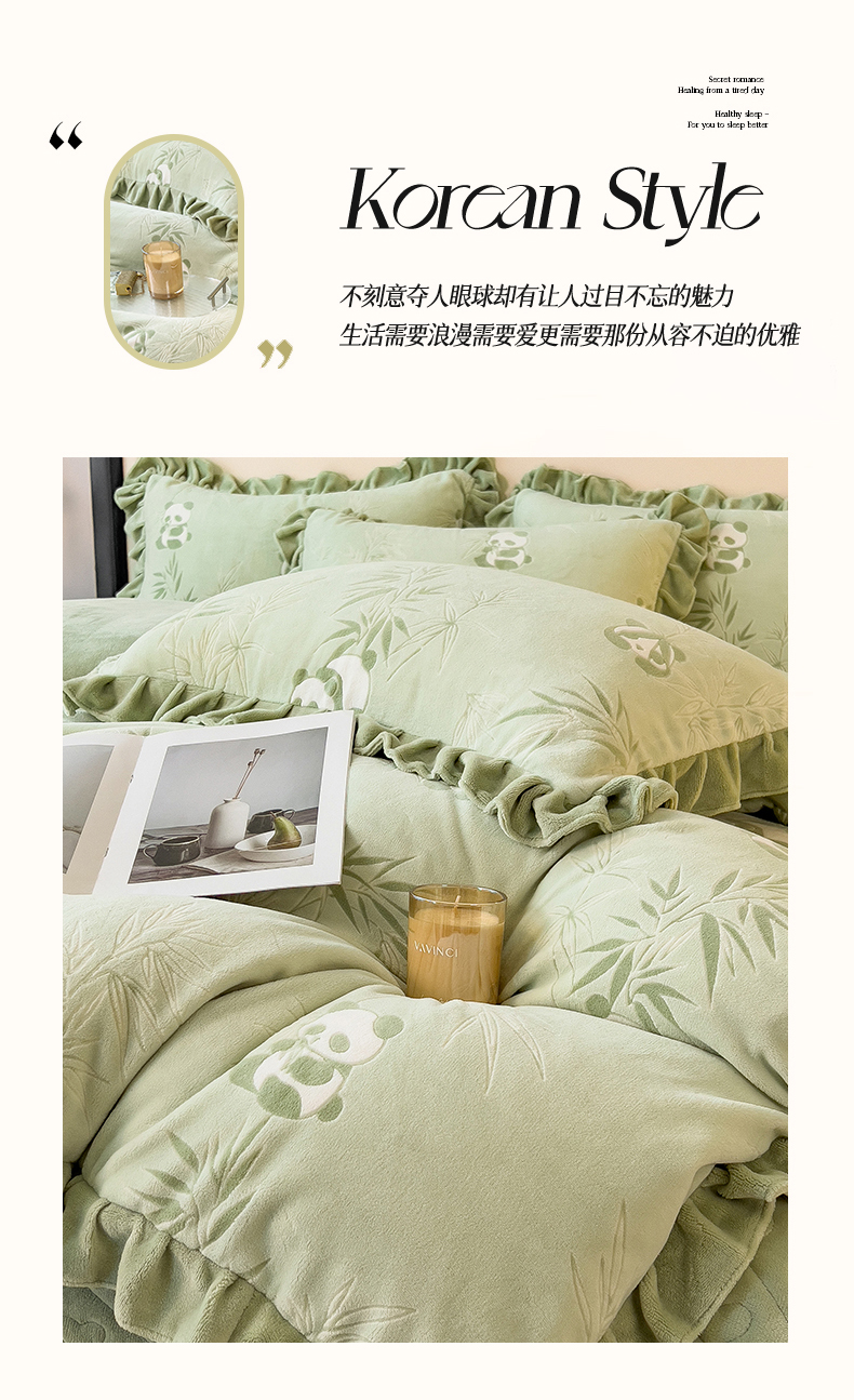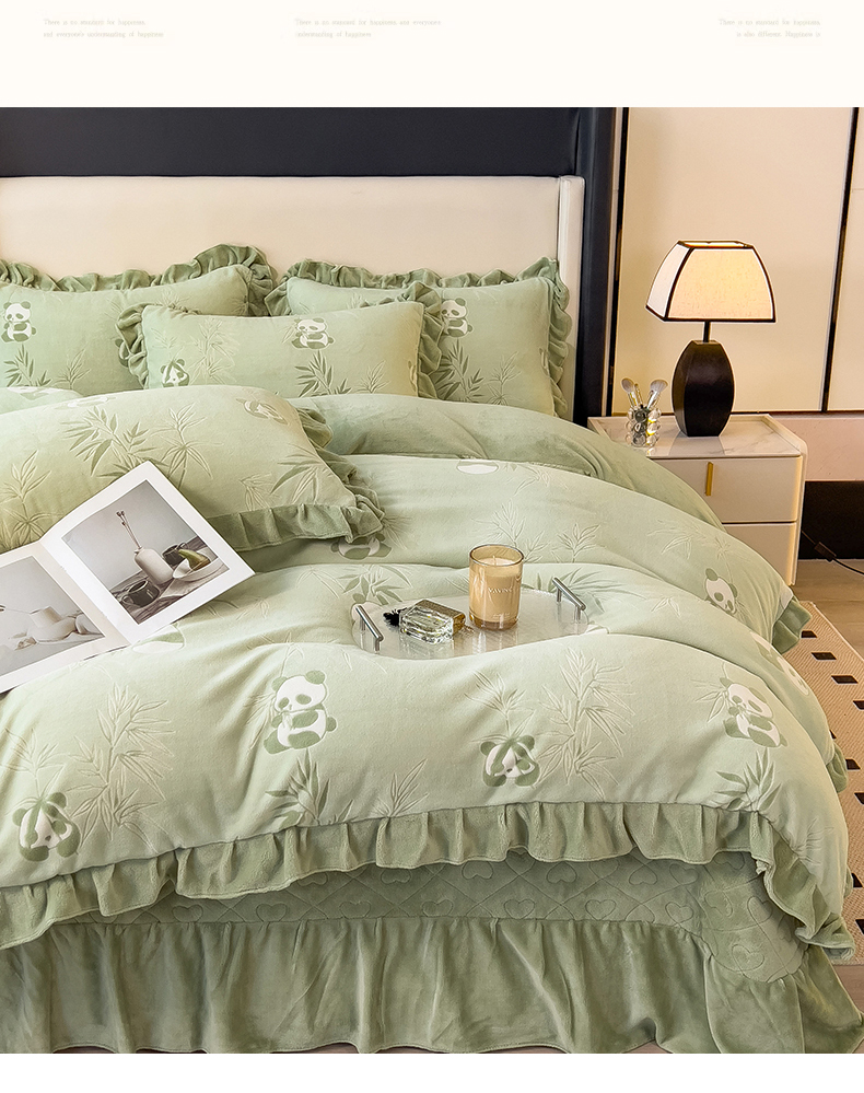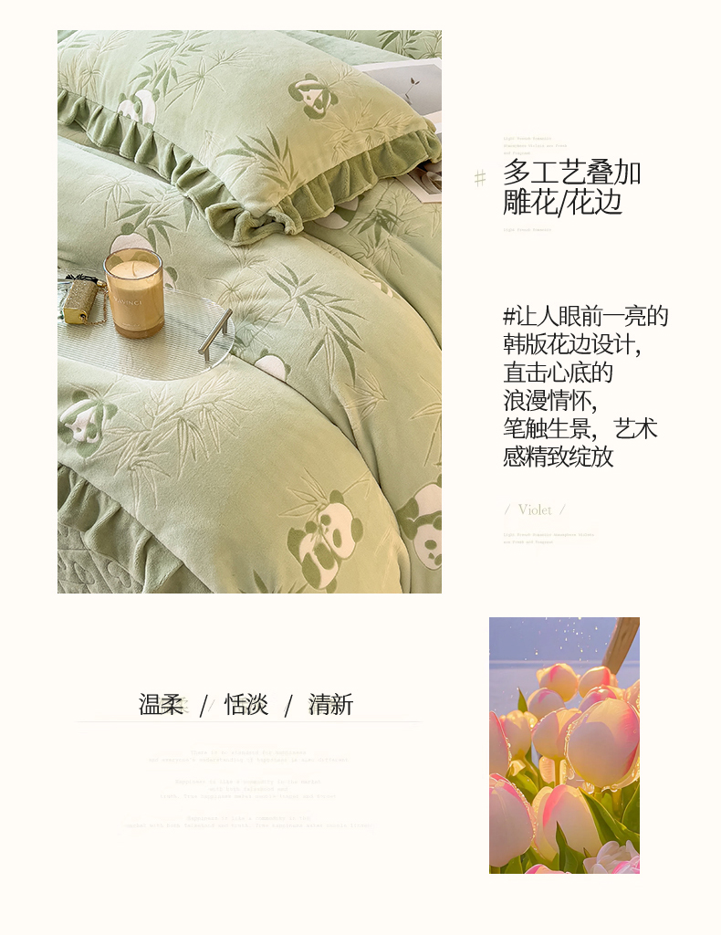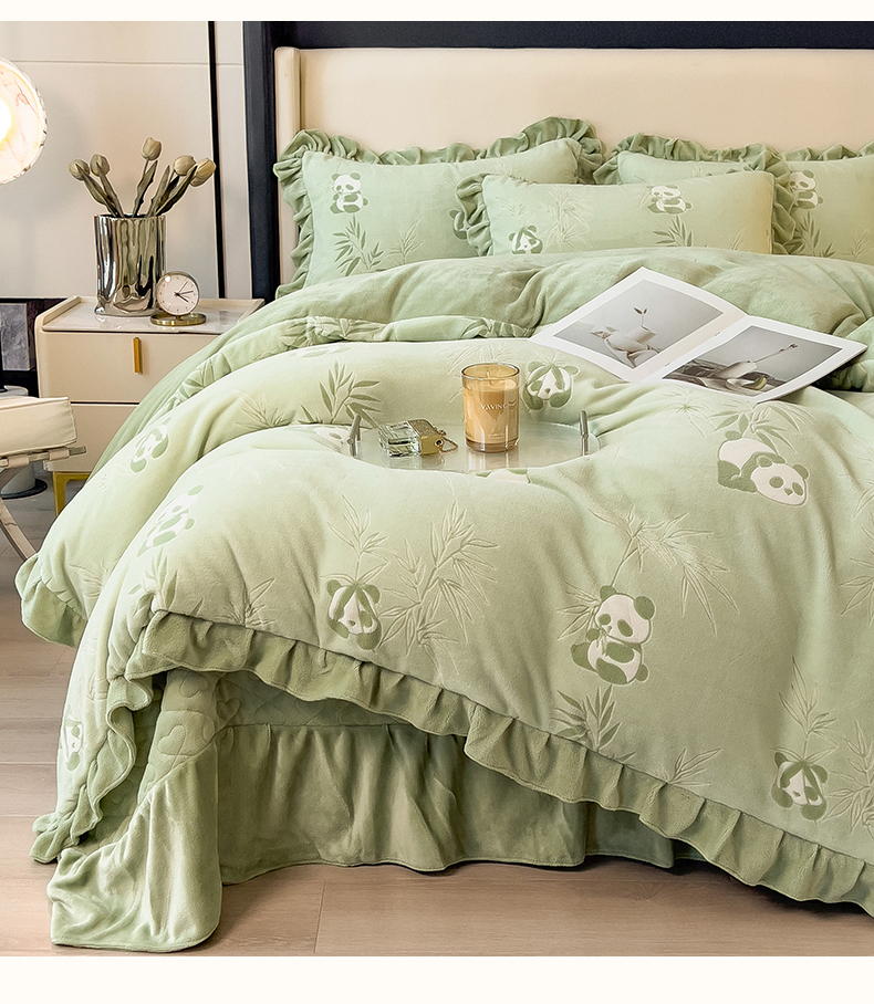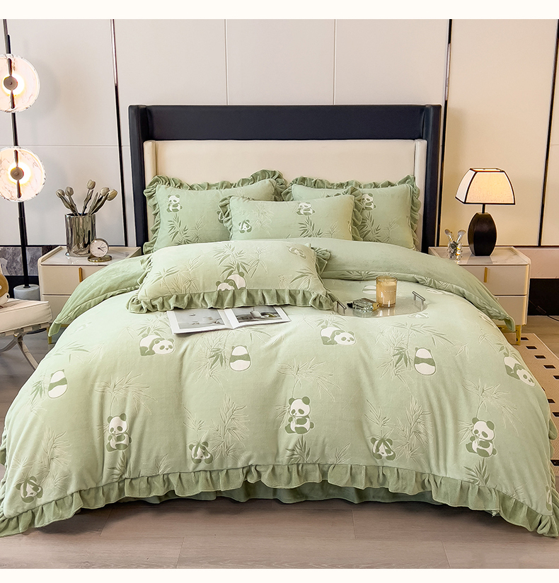 2024新品A类牛奶绒韩版雕花四件套 熊猫-绿