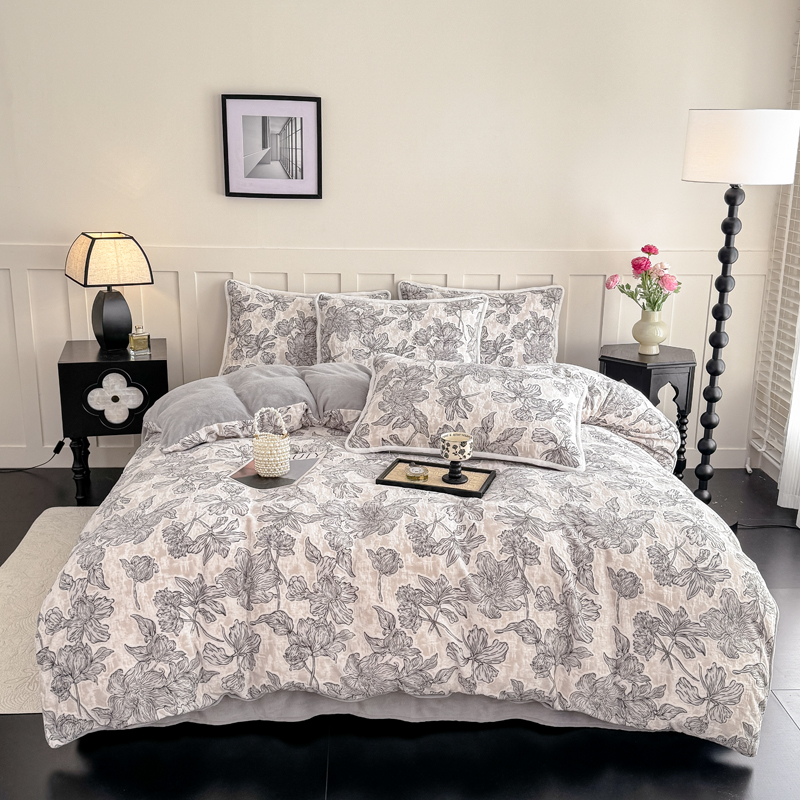 总(赛丽雅)2025秋冬新品130克加厚复古风印花磨毛四件套,风木槿,可颂,暮雪-灰,悄颜,秋恋-红,砚秋