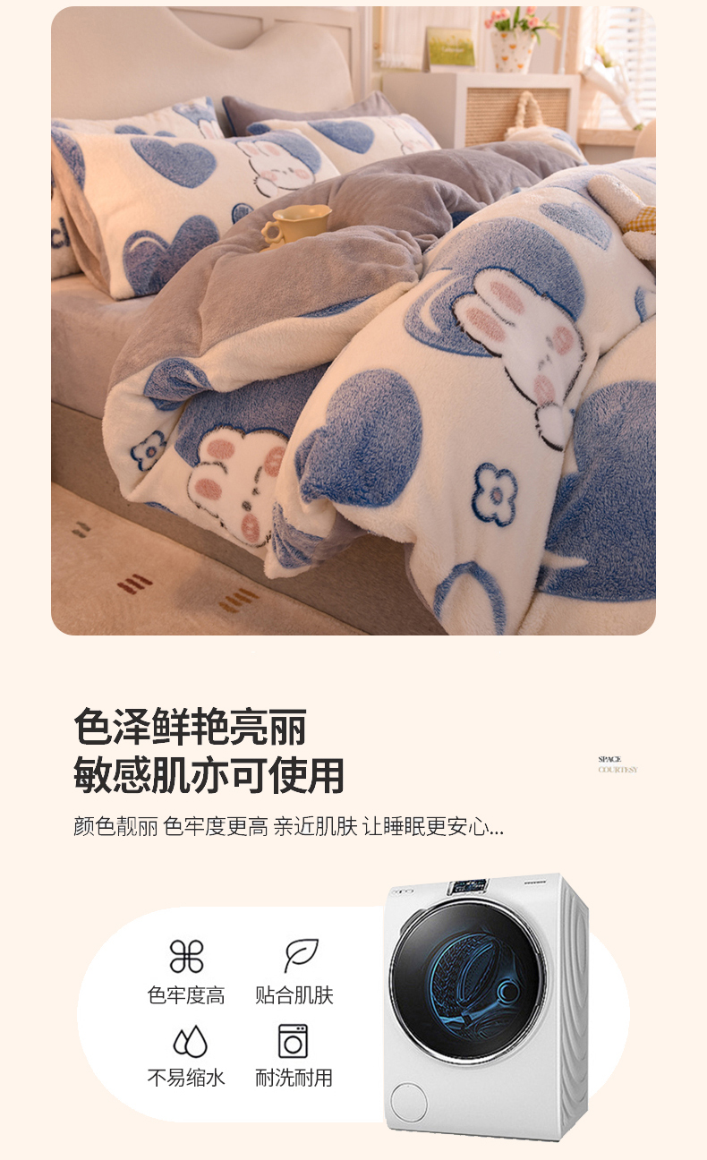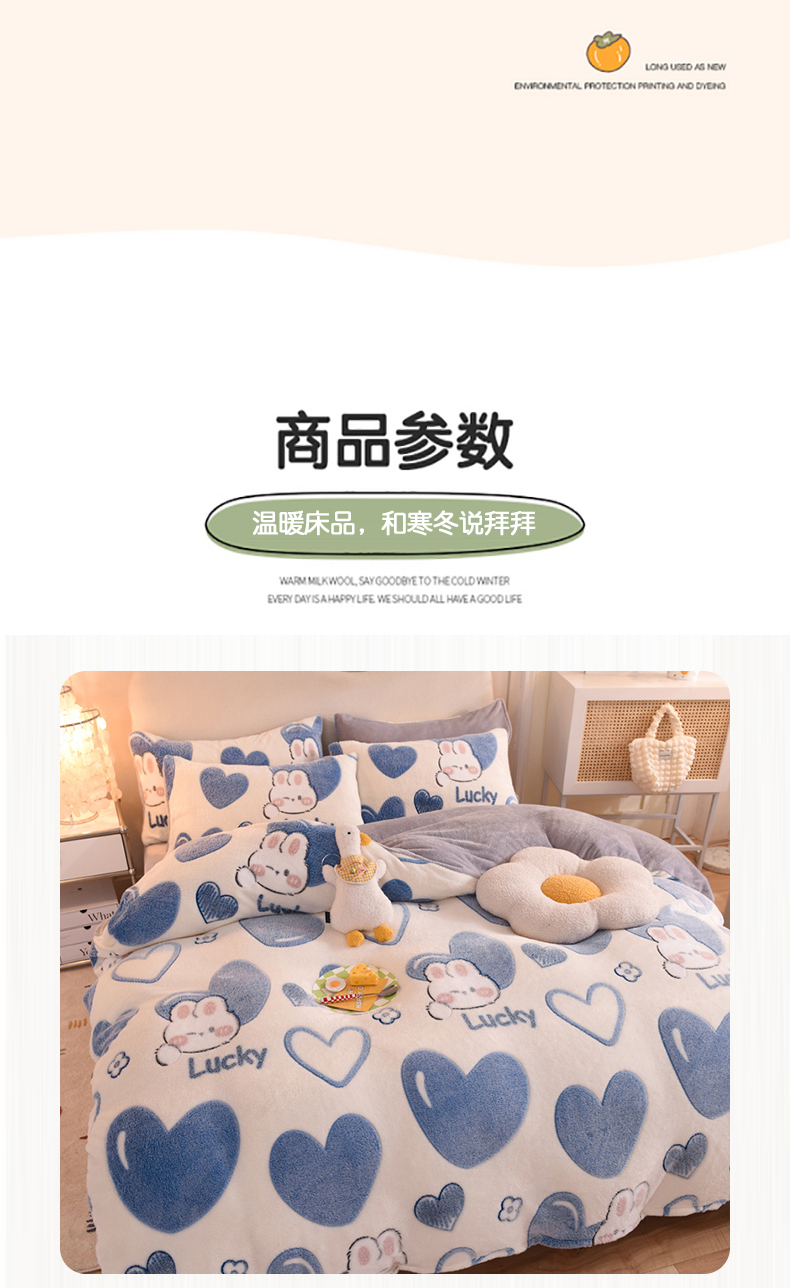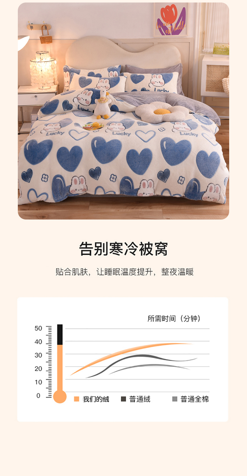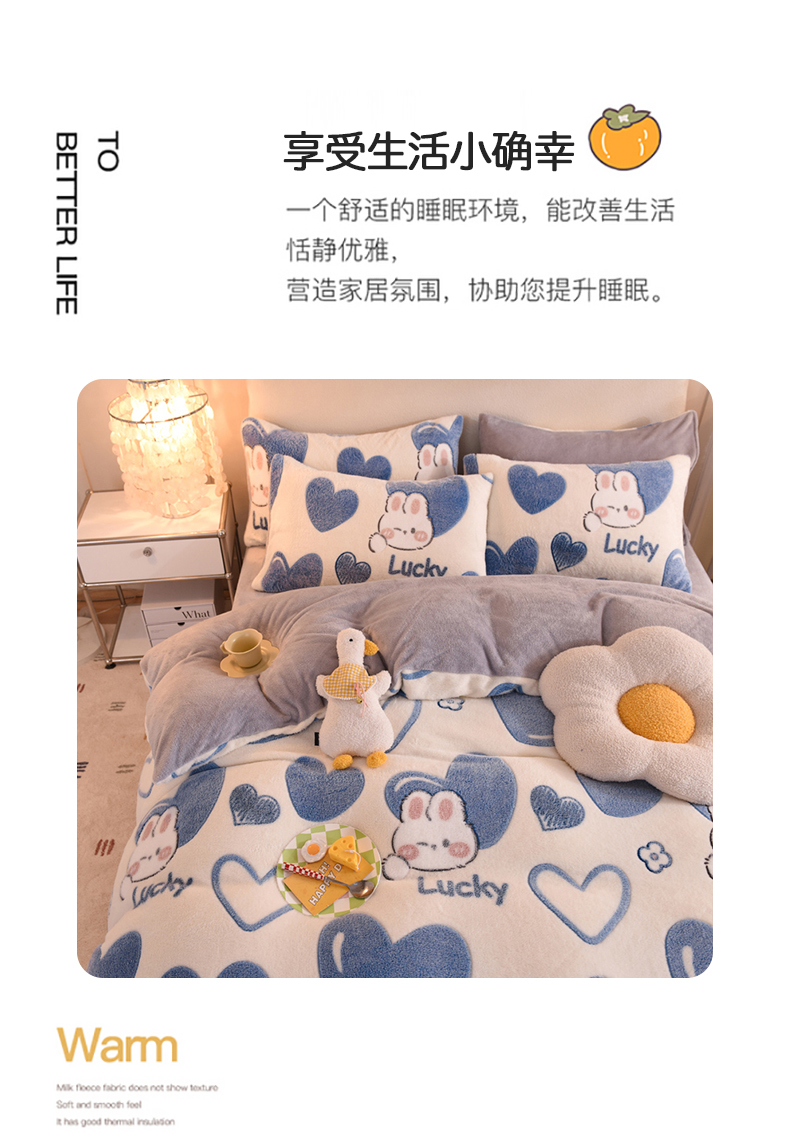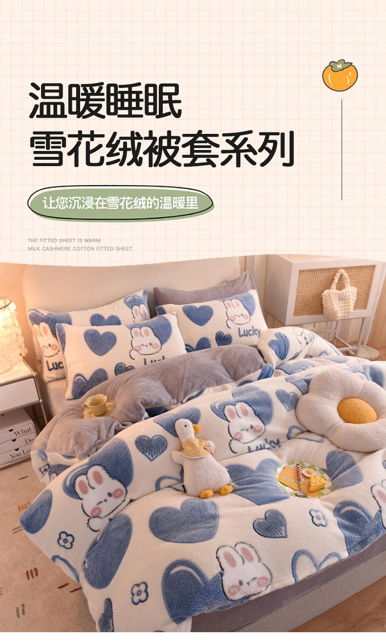 当前位置: 91家纺网 > 商品网购 > 床品套件 > 四件套 > 其它四件套 > 慕梵家居 2024新款雪花绒卡通四件套 爱心兔