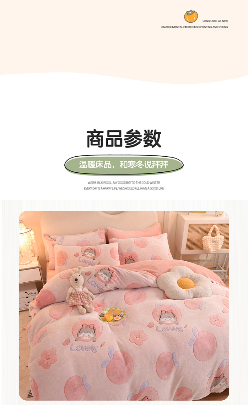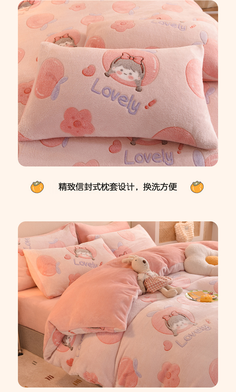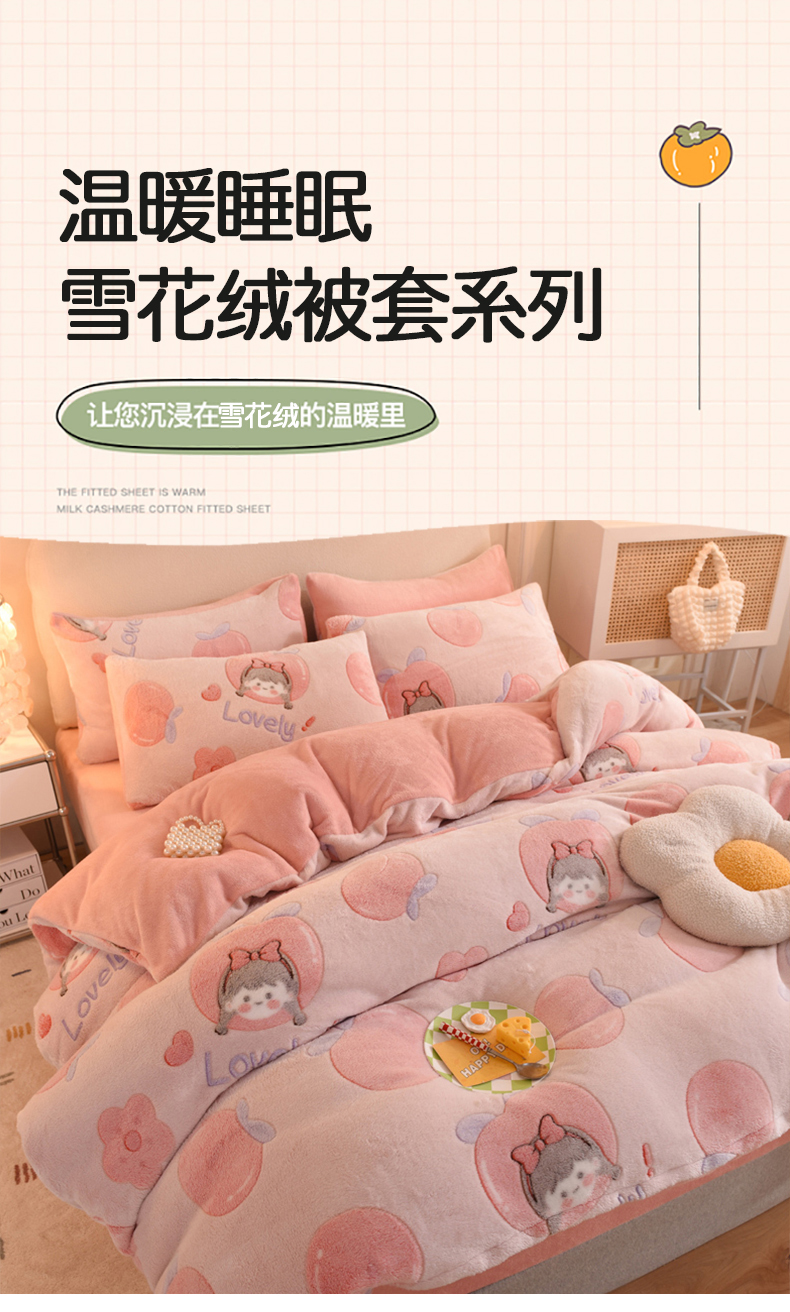 当前位置: 91家纺网 > 商品网购 > 床品套件 > 四件套 > 其它四件套 > 慕梵家居 2024新款雪花绒卡通四件套 桃子少女
