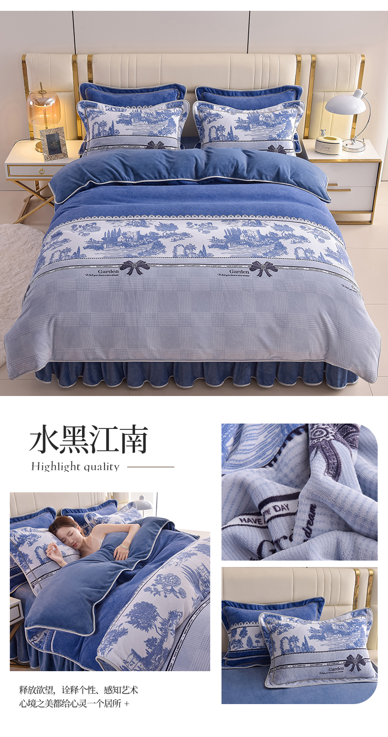 曼尼家纺2025高克重直播印花床裙款法莱绒金貂珊瑚绒牛奶绒四件套 水墨江南