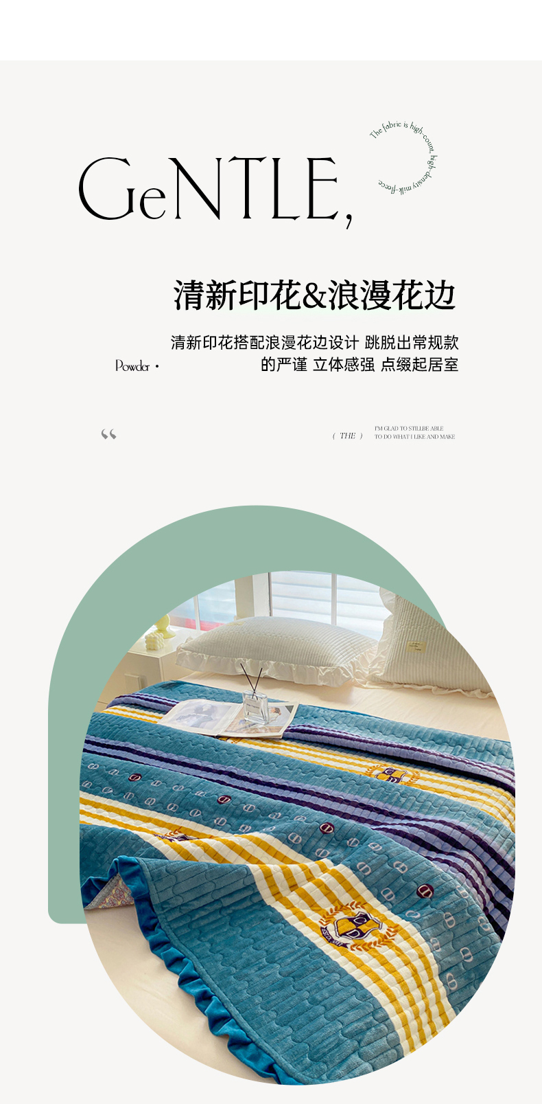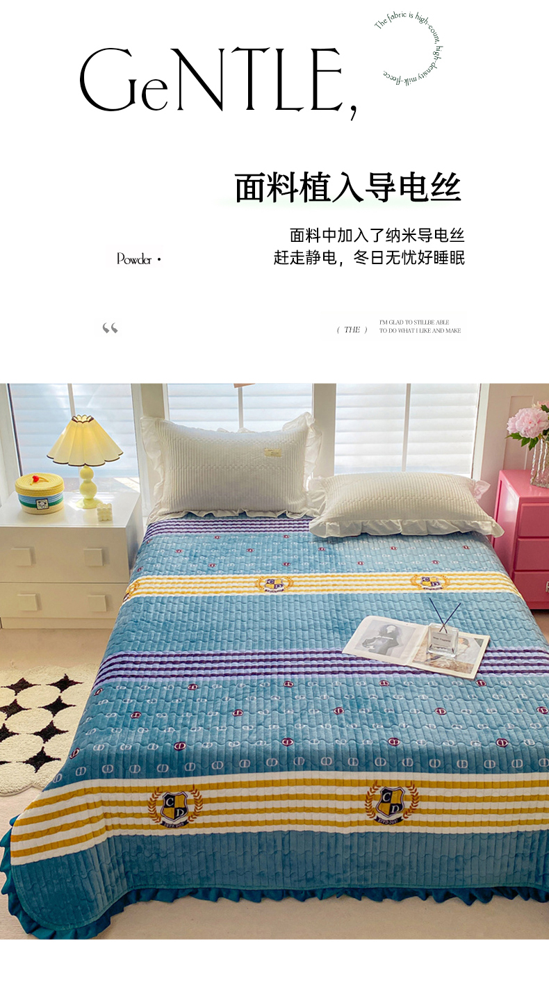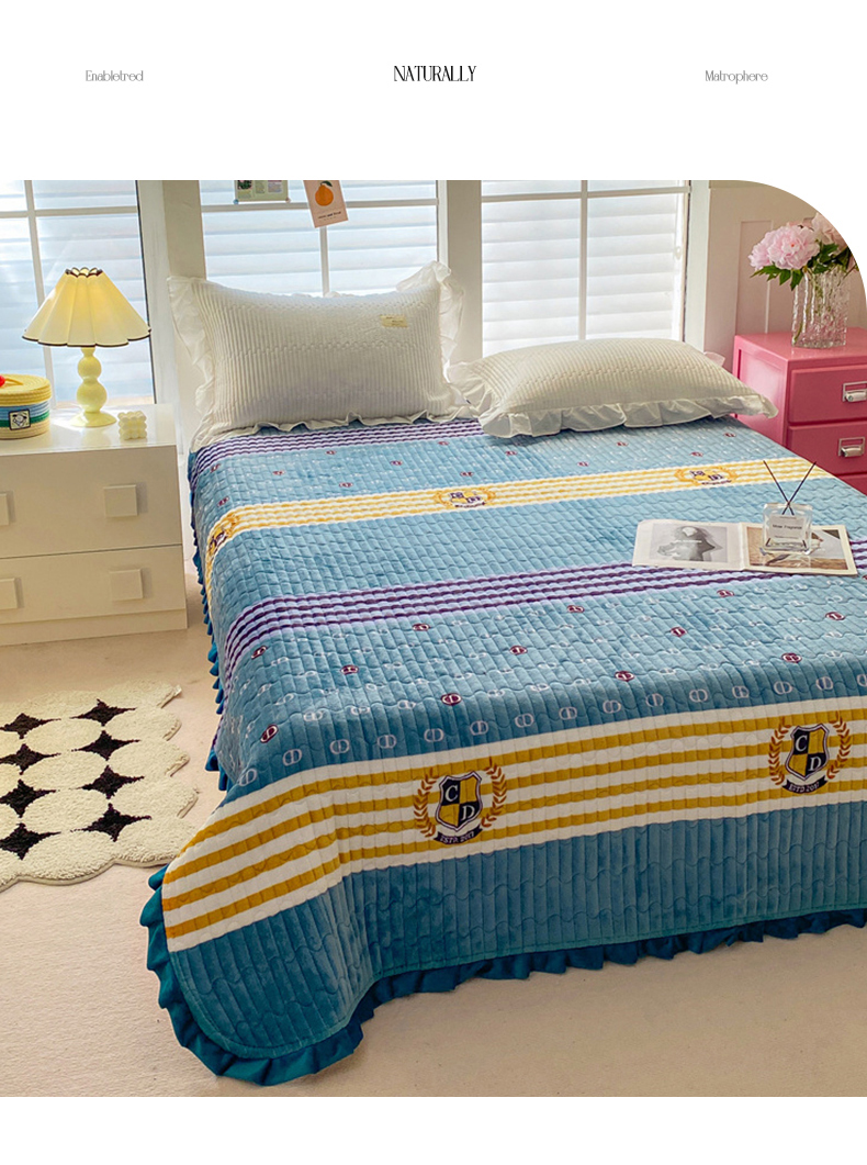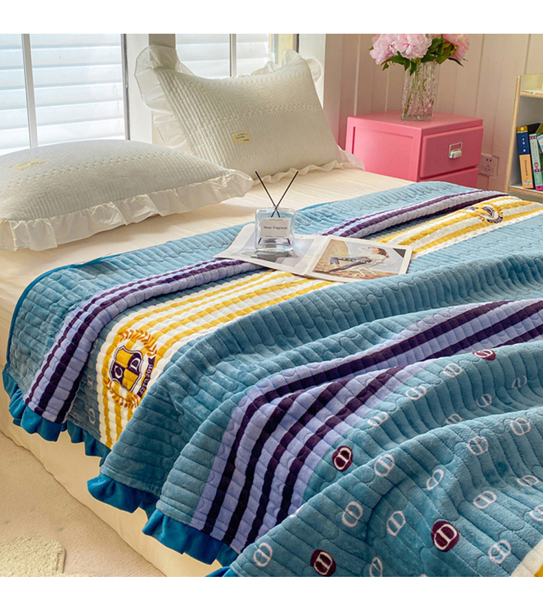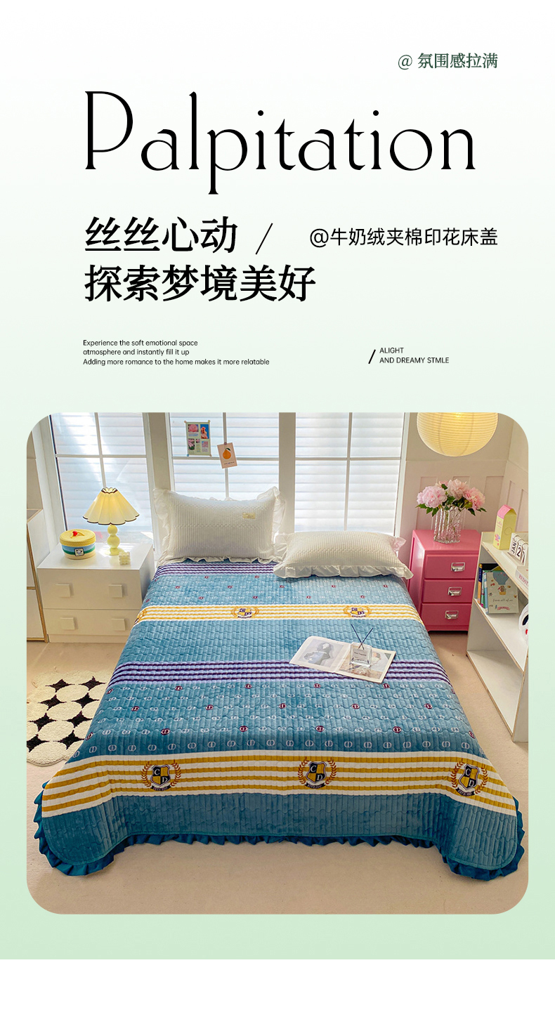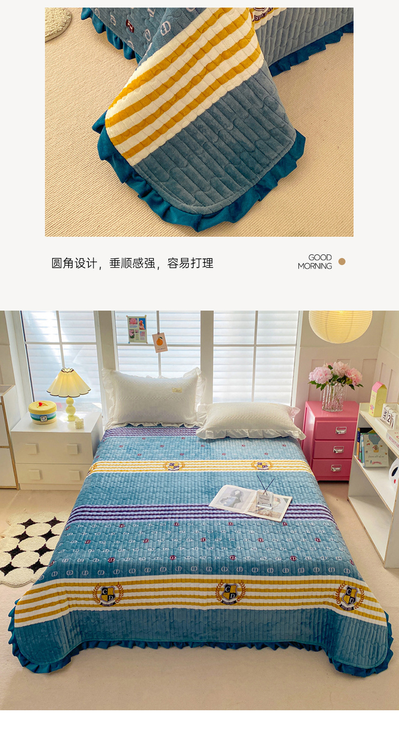 胜权家纺 2024秋冬新款印花牛奶绒加厚保暖圆角花边夹棉床盖 海军CD