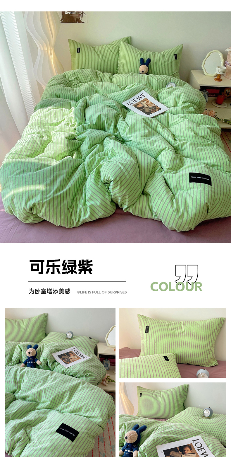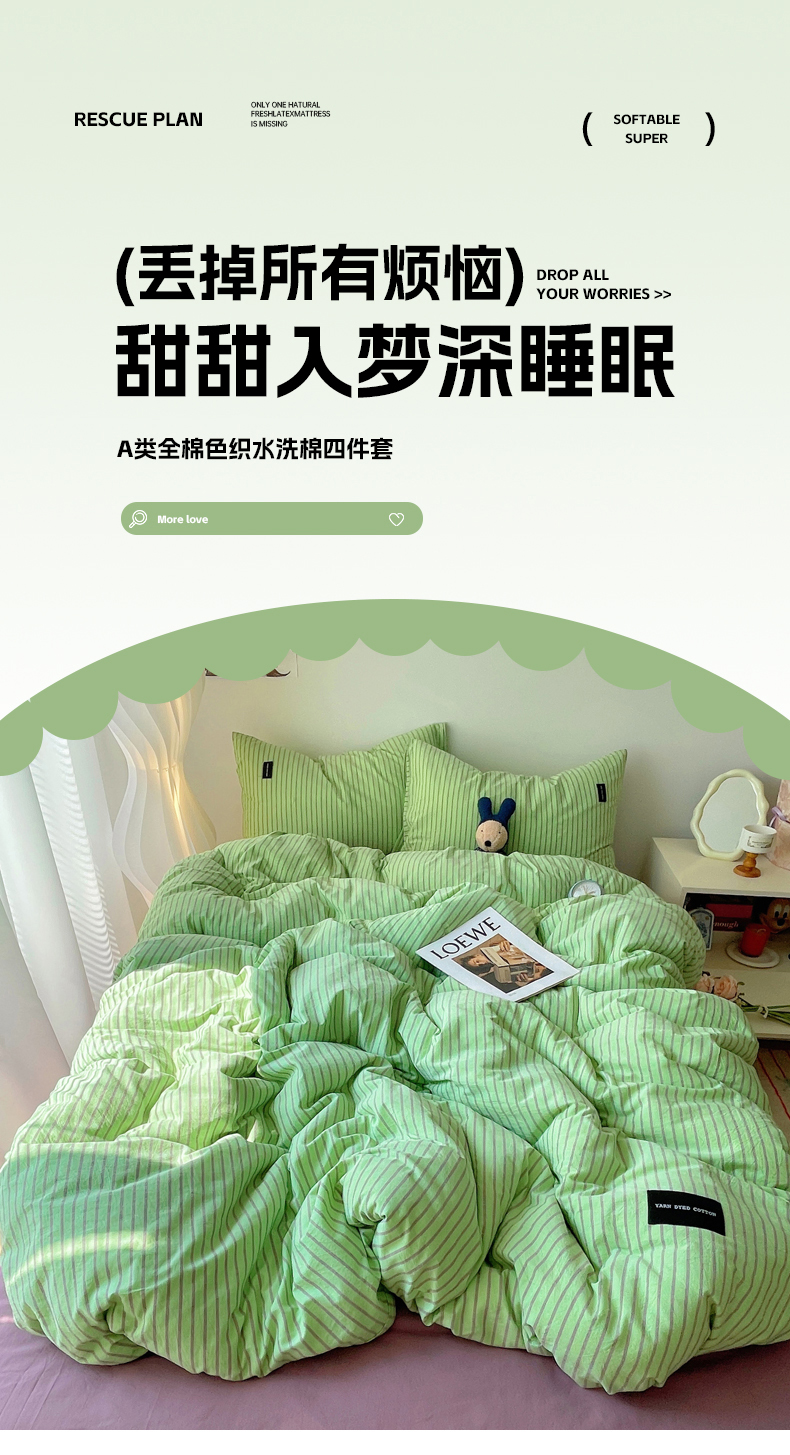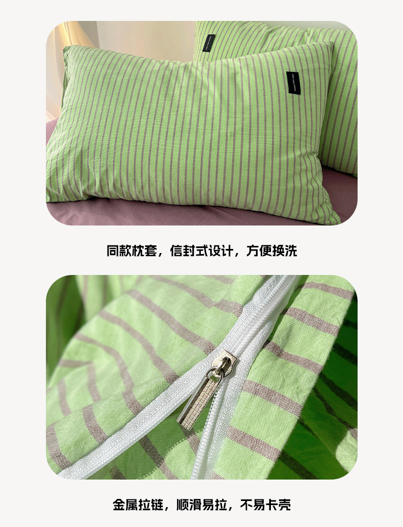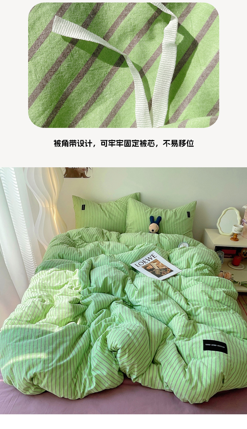 商品名称:呗旺鹿 2024新款A类全棉色织水洗棉马卡龙系列四件套 可乐绿紫