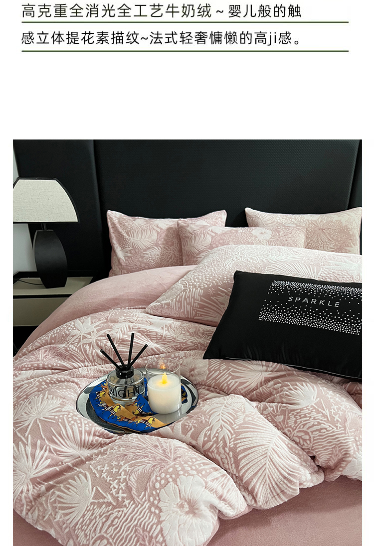 当前位置: 91家纺网 > 商品网购 > 床品套件 > 四件套 > 牛奶绒四件套 > HL原创 2024新款轻奢风雕花牛奶绒四件套 都市