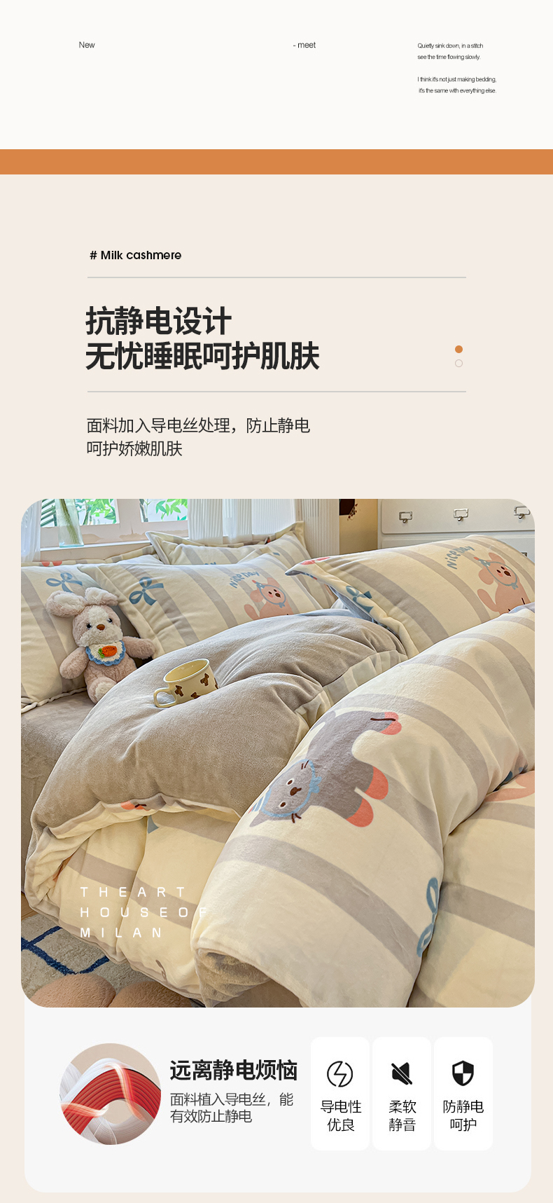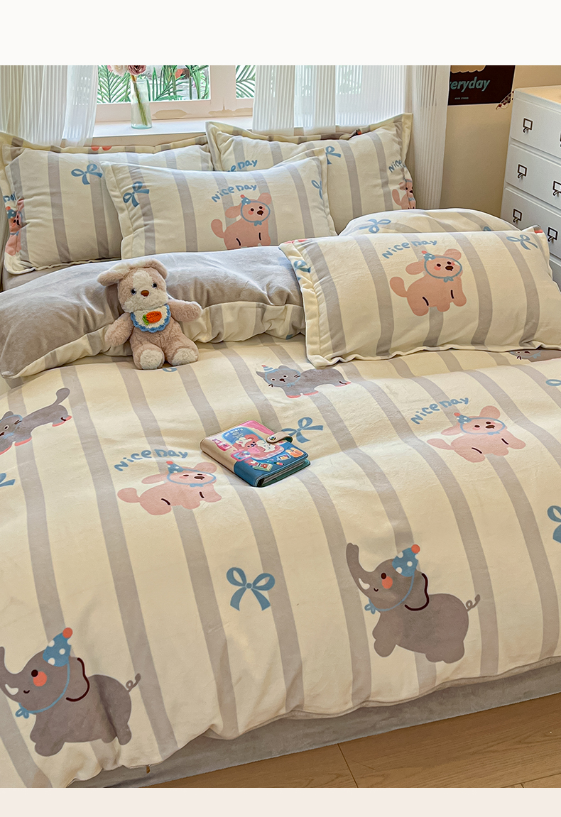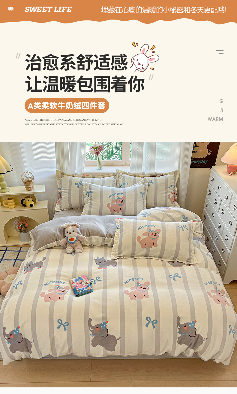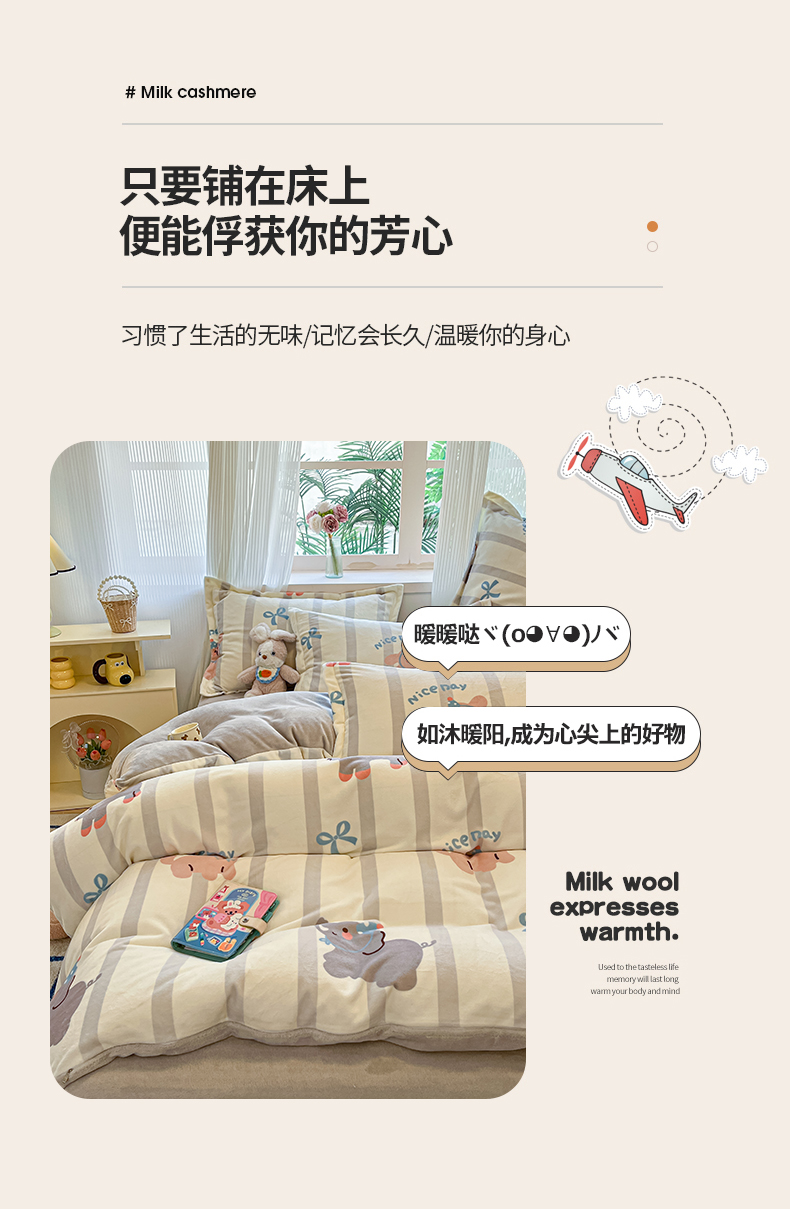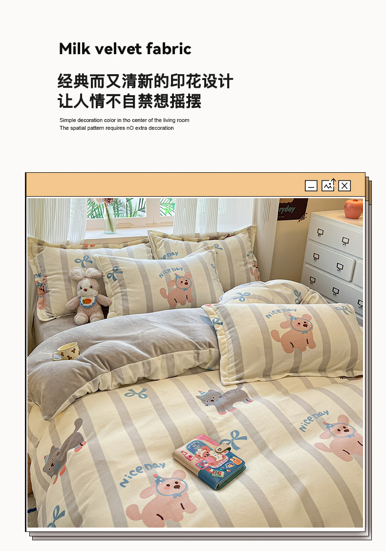 当前位置: 91家纺网 > 商品网购 > 床品套件 > 四件套 > 牛奶绒四件套 > 寐居家纺 2024新款A类小清新牛奶绒印花四件套 萌萌乐园