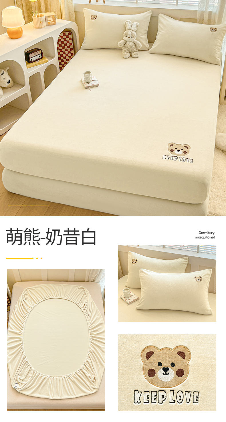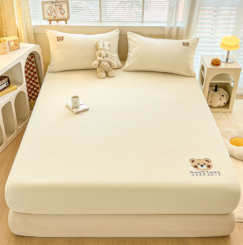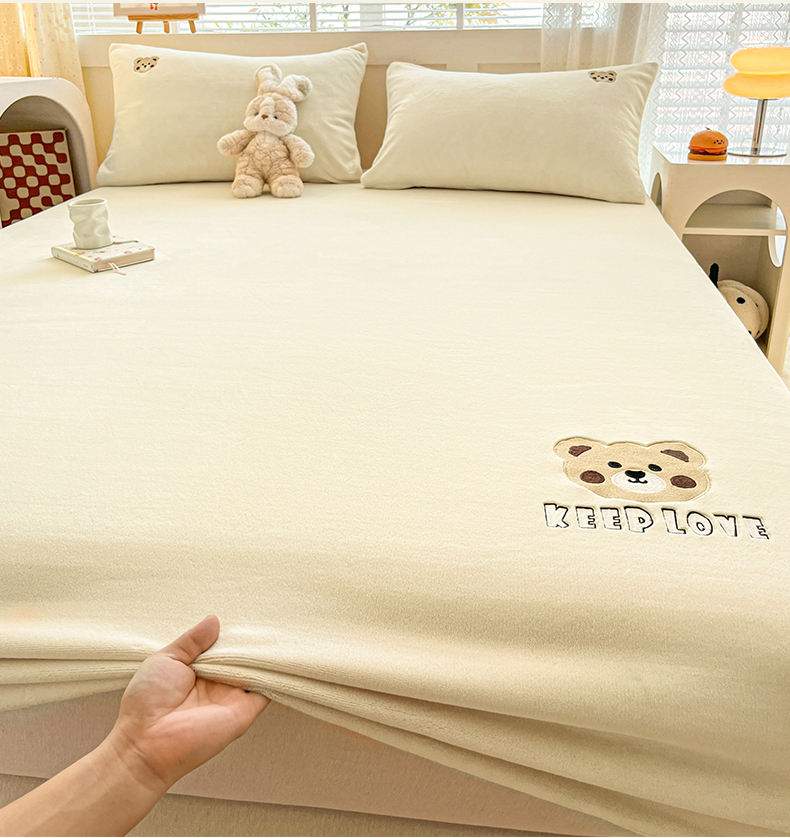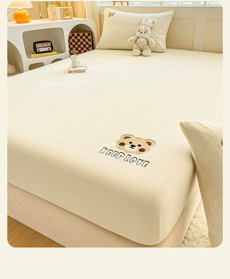 笙意家纺 2025新款牛奶绒卡通单品刺绣床笠 萌熊-奶昔白