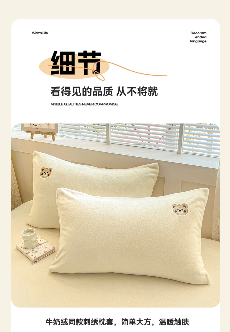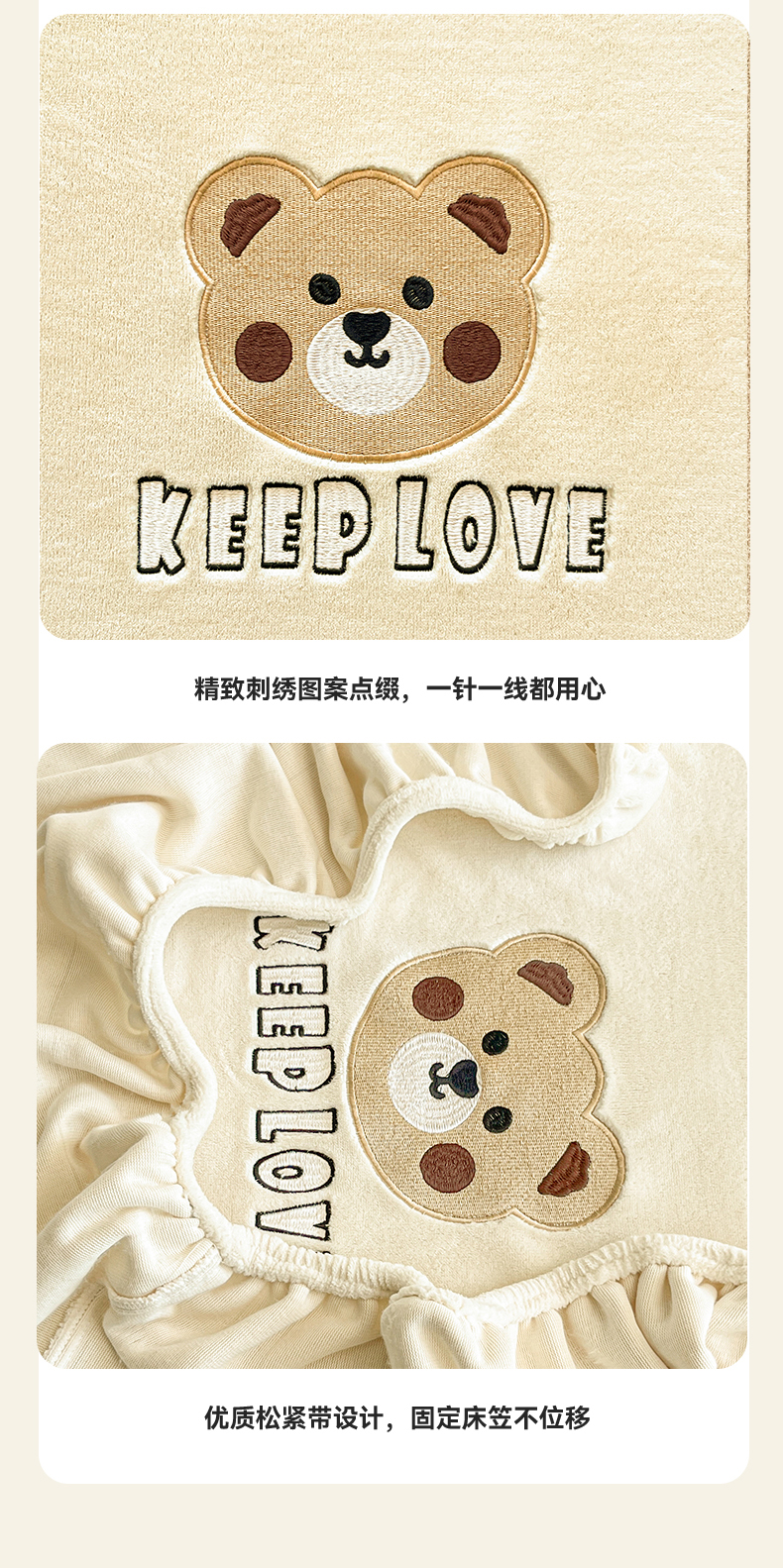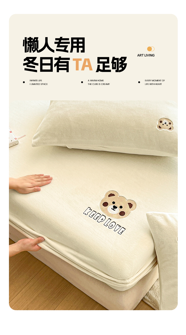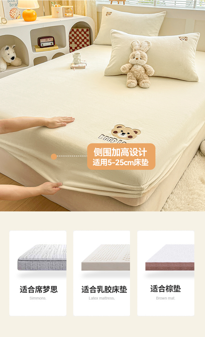 笙意家纺 2025新款牛奶绒卡通单品刺绣床笠 萌熊-奶昔白