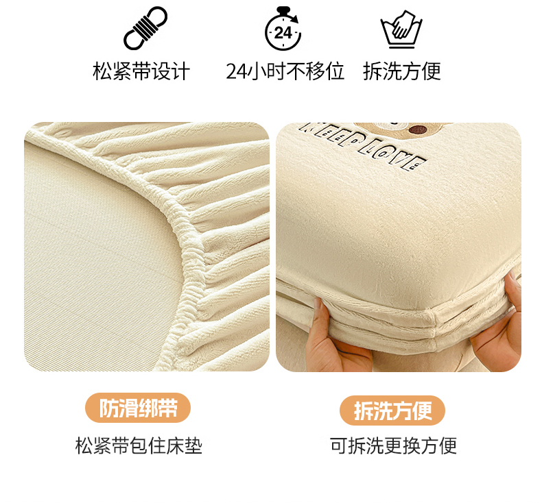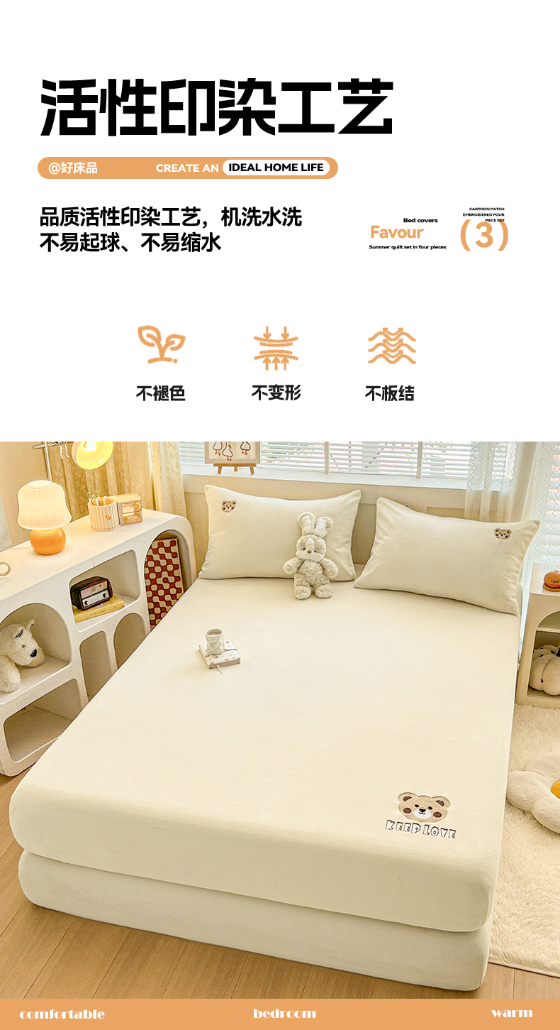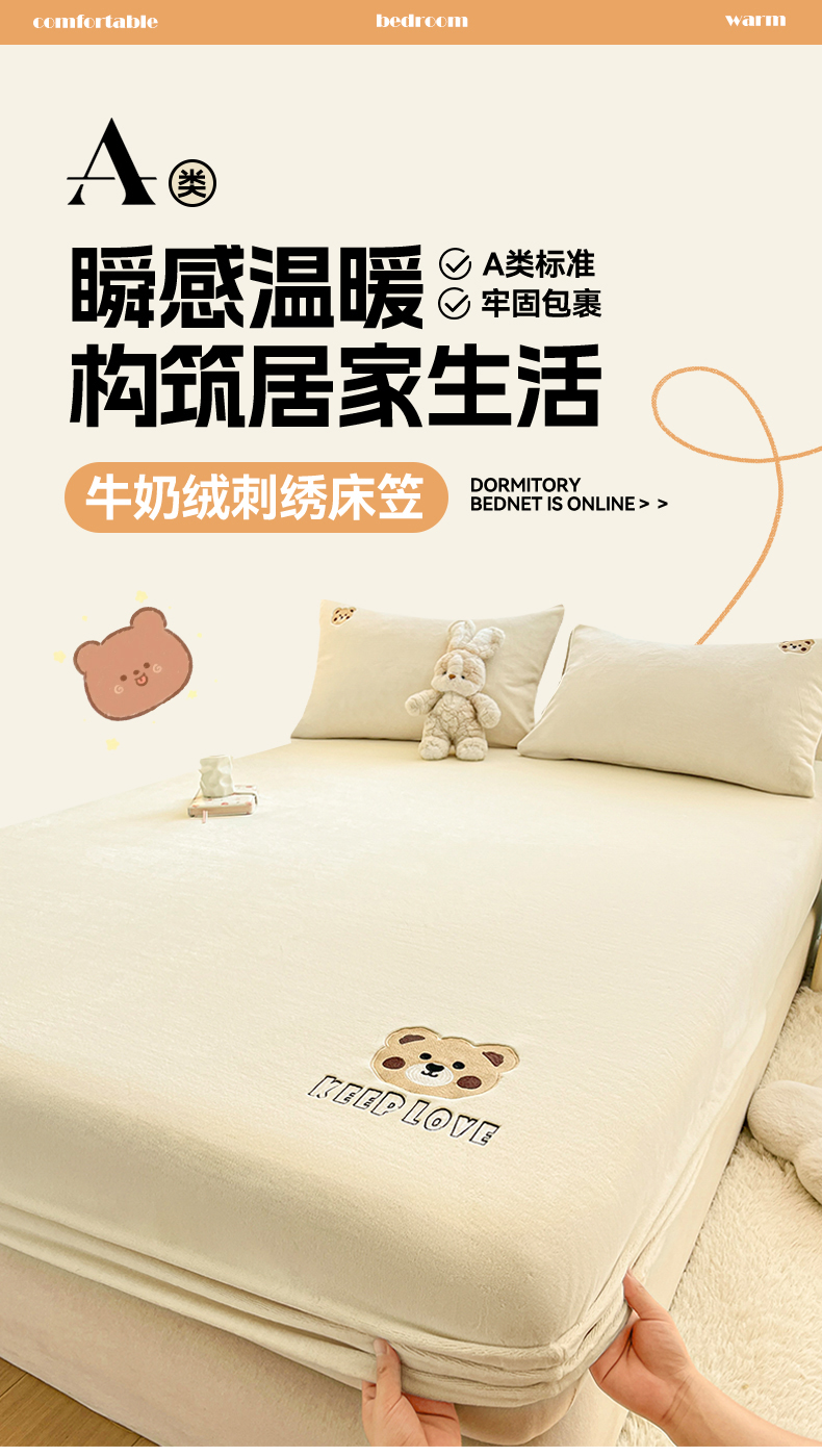 • 91家纺网 家纺一手货源 找家纺 笙意家纺 2025新款牛奶绒卡通单品刺绣床笠 萌熊-奶昔白
