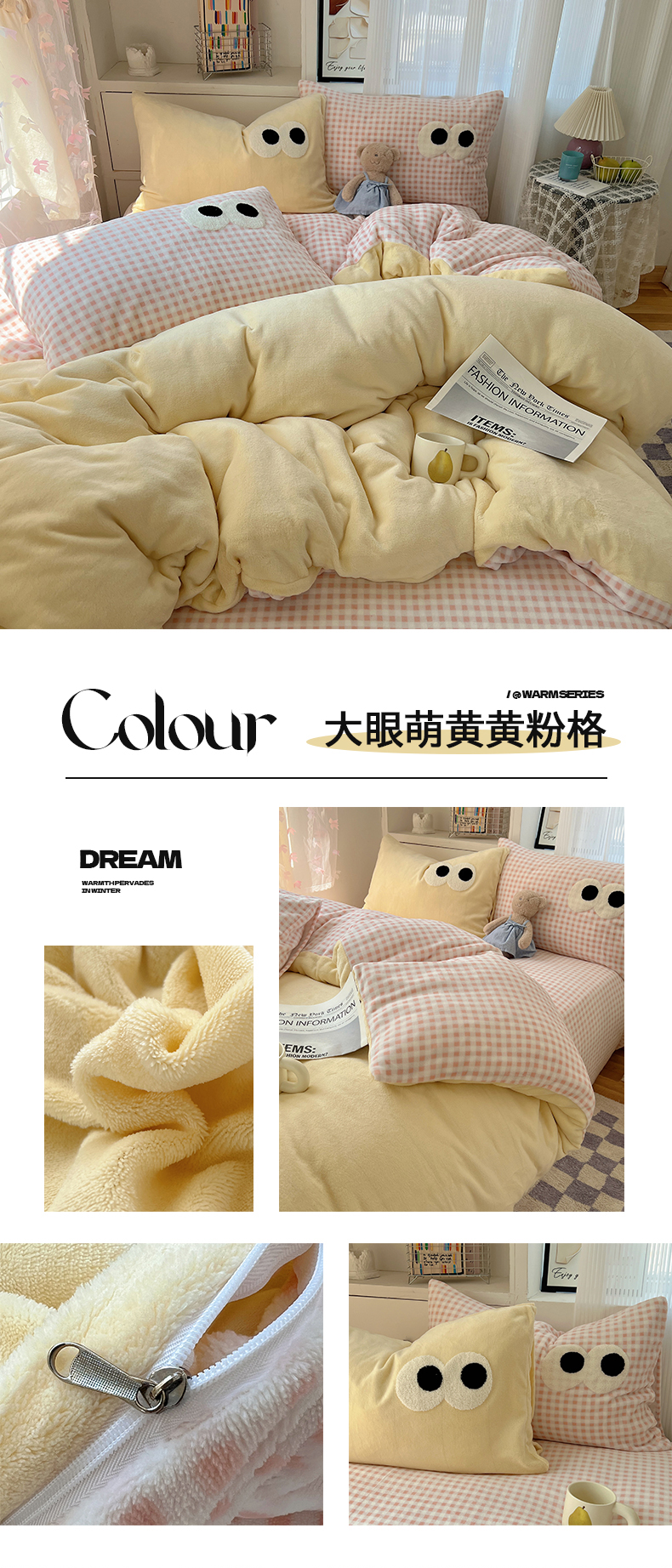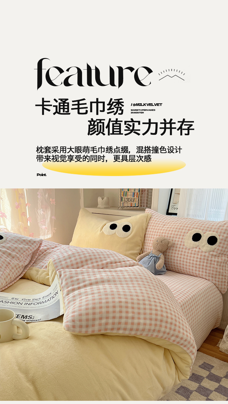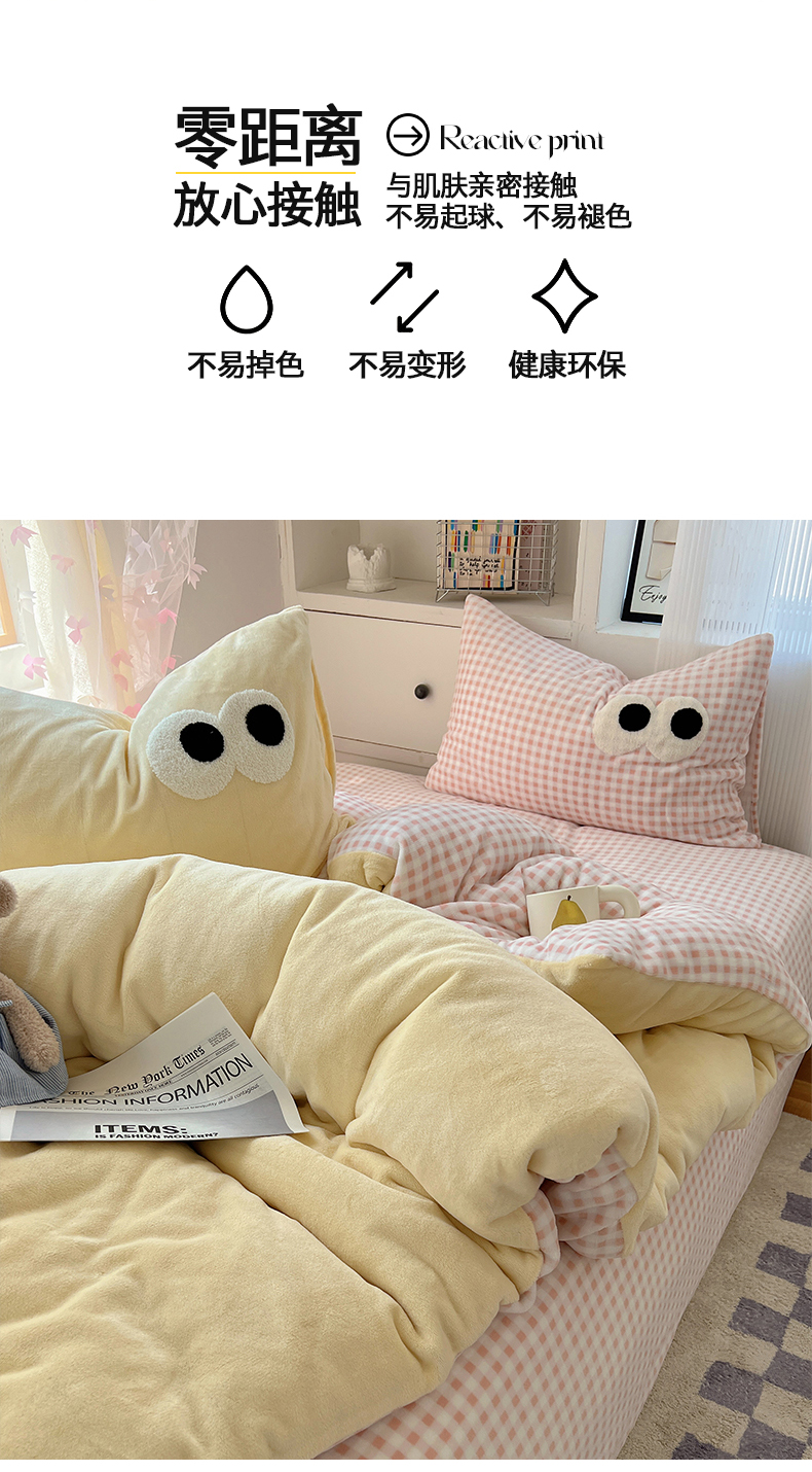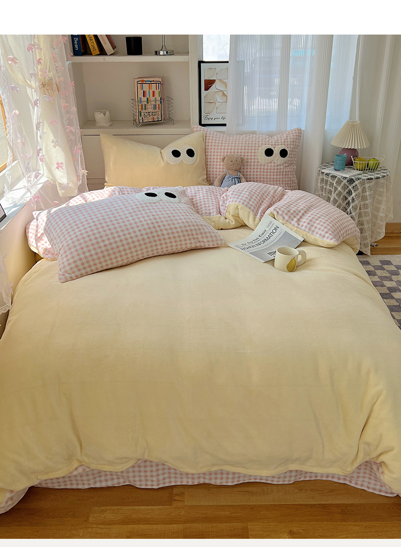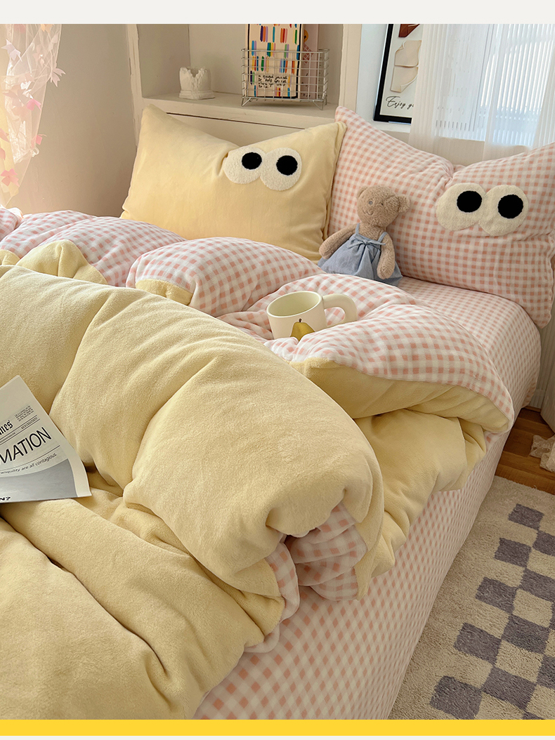 当前位置: 91家纺网 > 商品网购 > 床品套件 > 四件套 > 牛奶绒四件套 > 桃子家居 2024新款A类ins加厚毛巾绣大眼萌混搭撞色牛奶绒系列四件套 绒毛巾绣-大眼萌黄黄粉格