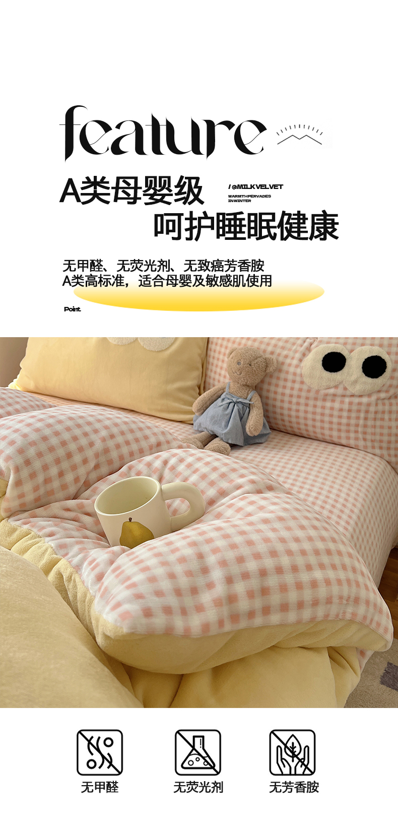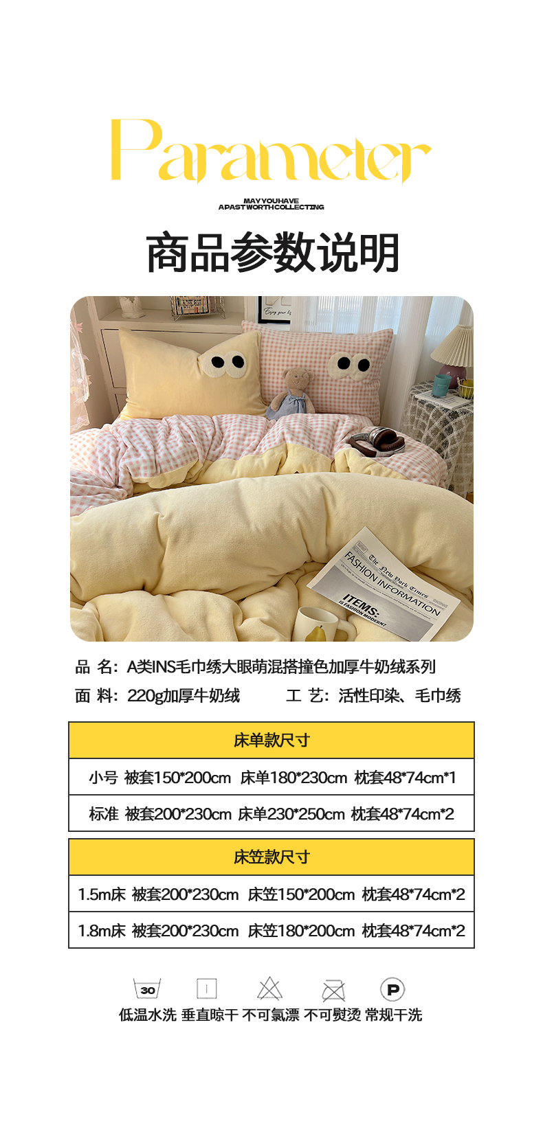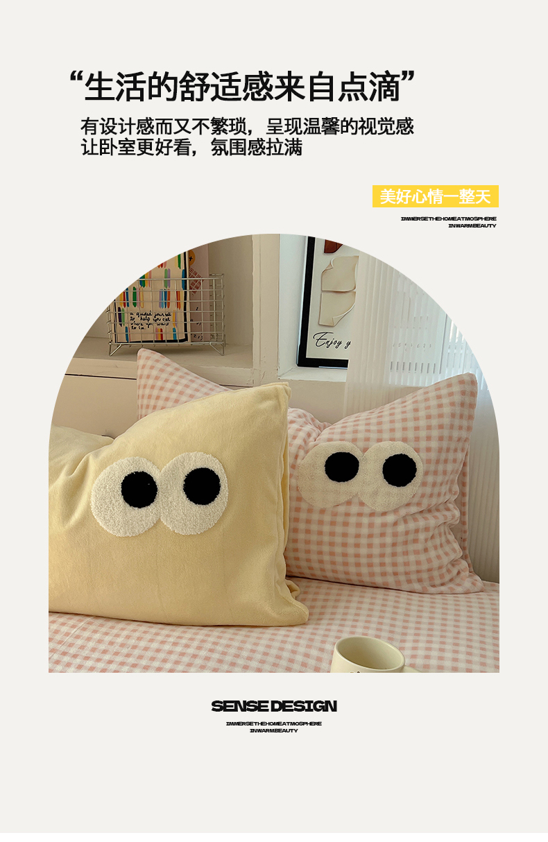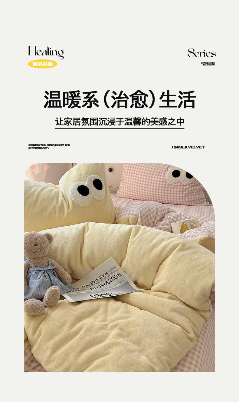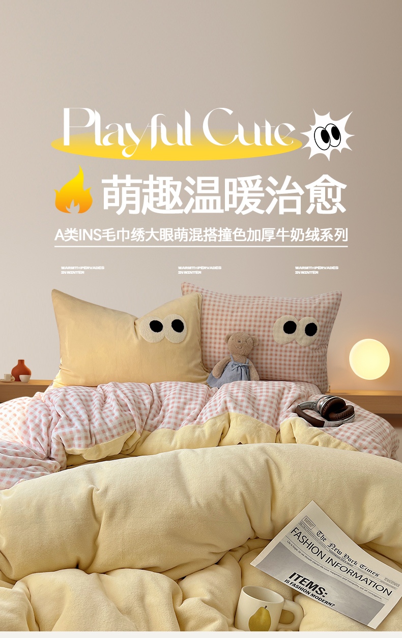 当前位置: 91家纺网 > 商品网购 > 床品套件 > 四件套 > 牛奶绒四件套 > 桃子家居 2024新款A类ins加厚毛巾绣大眼萌混搭撞色牛奶绒系列四件套 绒毛巾绣-大眼萌黄黄粉格
