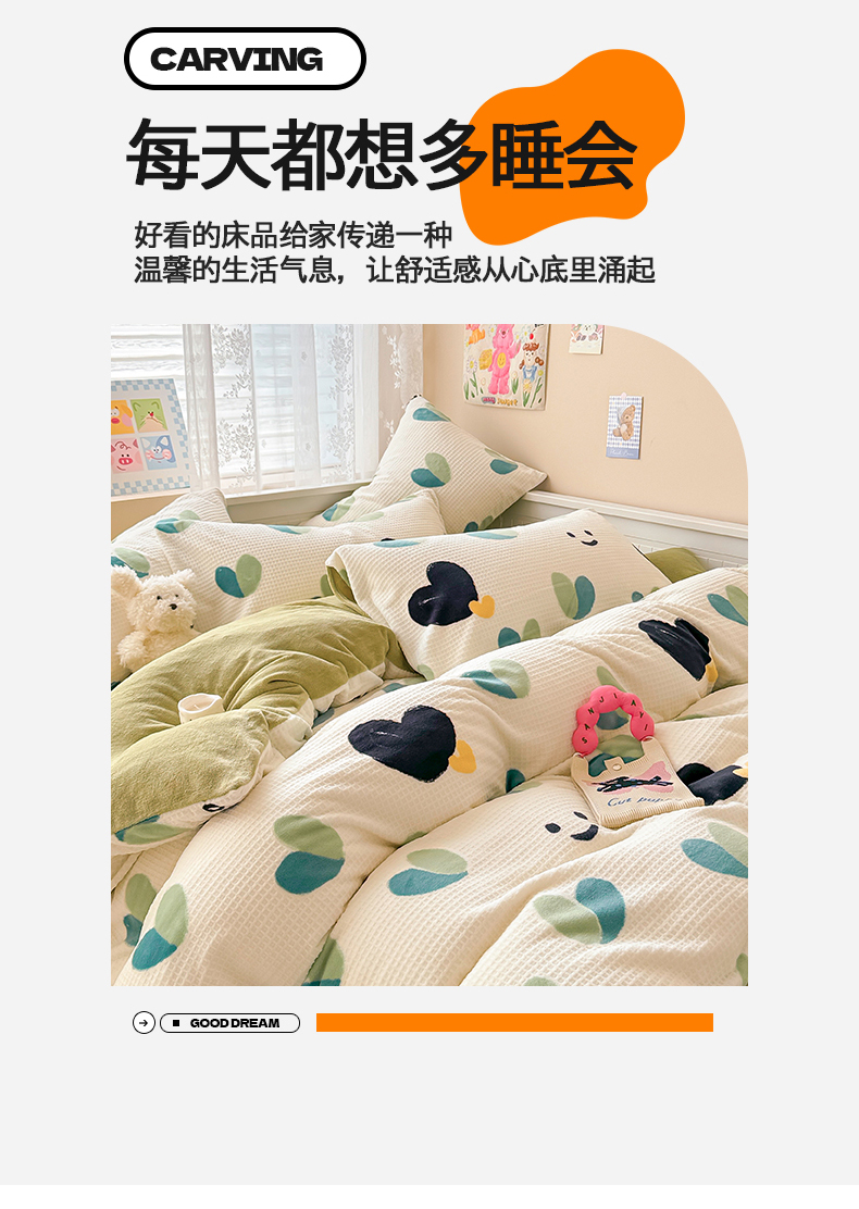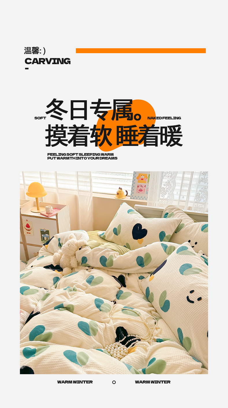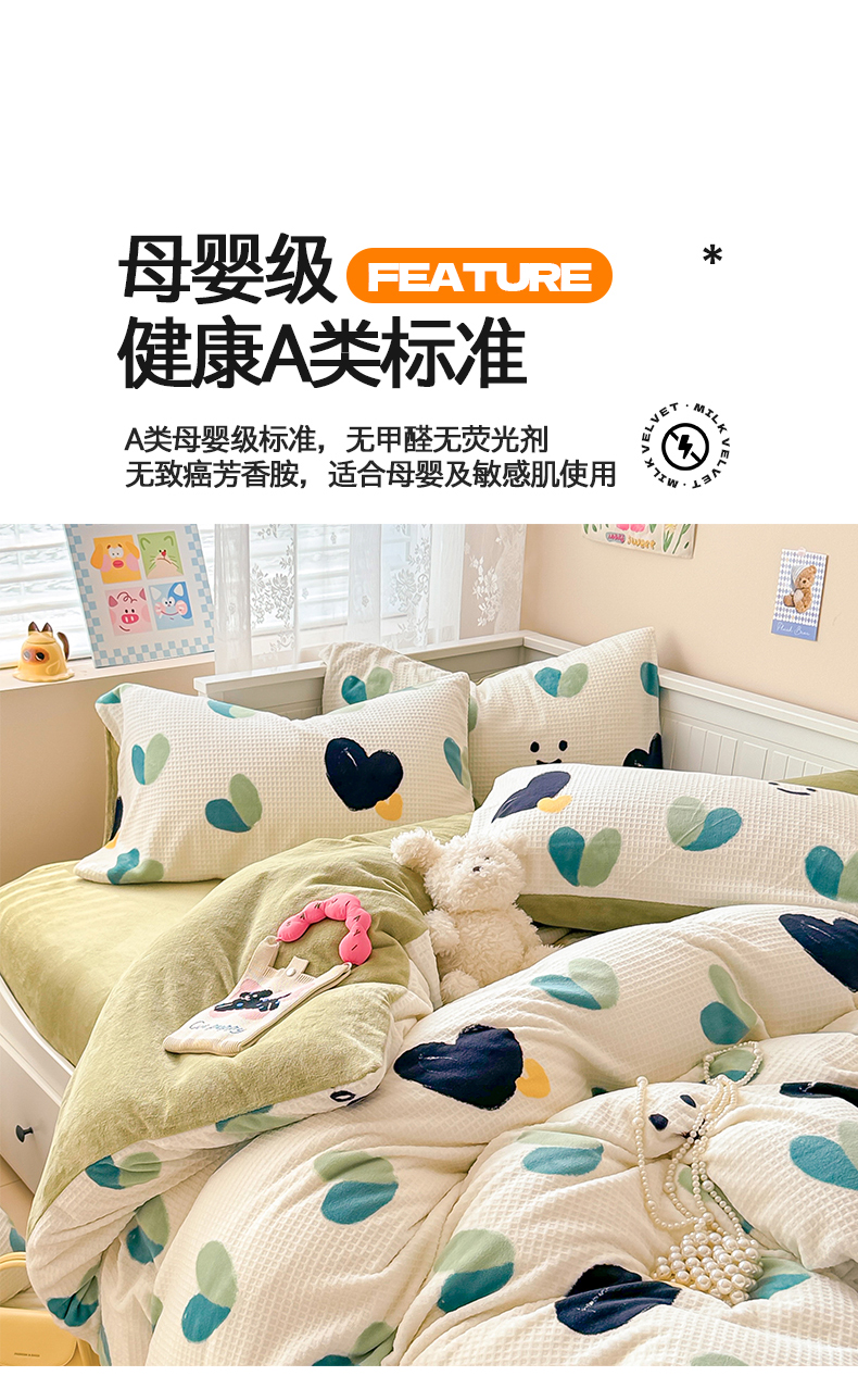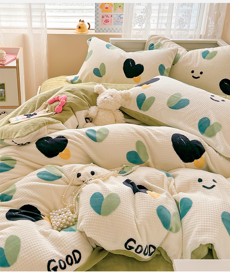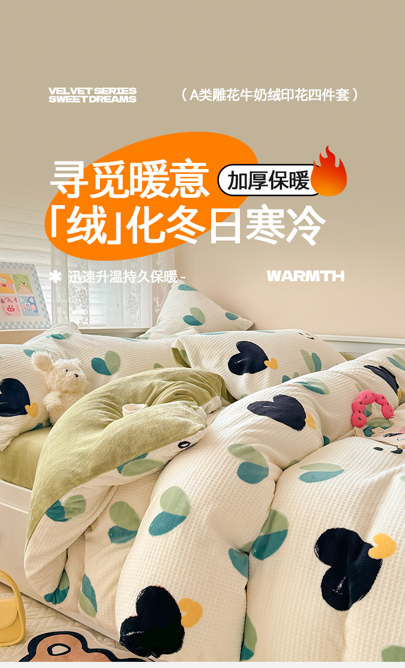 商品名称:典曼家纺 2024新款A类印花牛奶绒雕花四件套 微笑爱心