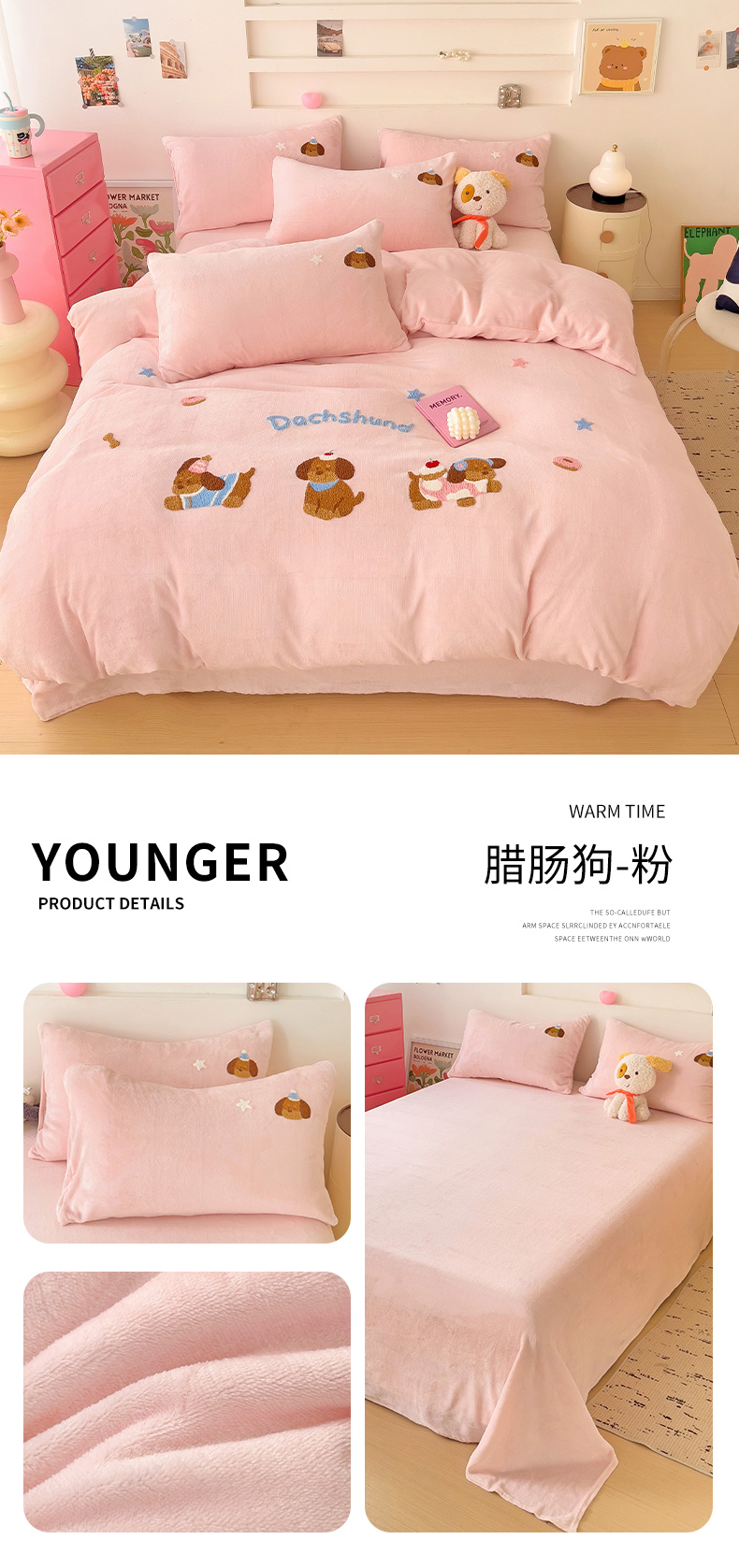 商品名称:梦之岛 2024新款牛奶绒卡通毛巾绣四件套腊肠狗 腊肠狗-粉