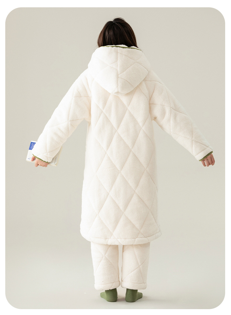 (总)洛兰沙家居馆 2024新款秋冬季清新款睡衣女三层夹棉珊瑚绒加厚保暖两件套女士可外穿加绒家居服,白色
