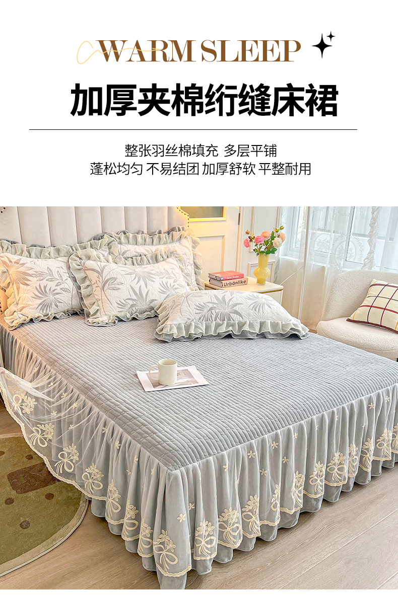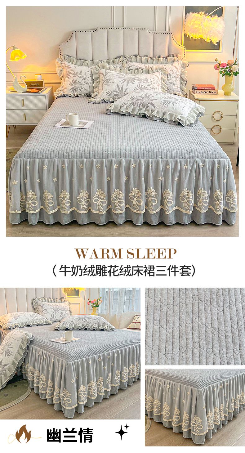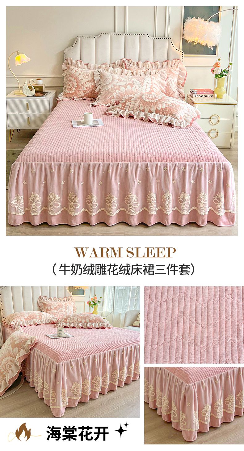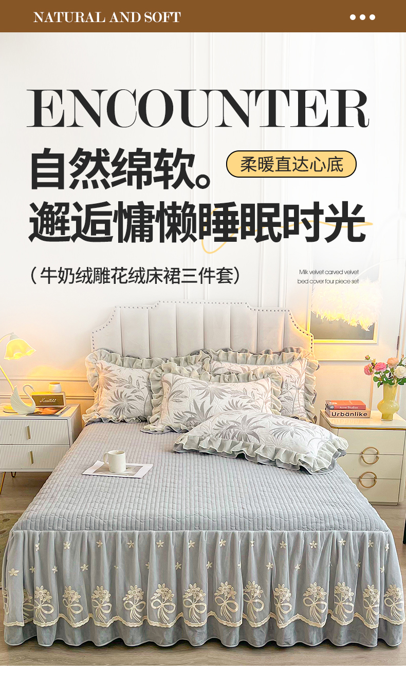 当前位置: 91家纺网 > 商品网购 > 床品套件 > 三件套 > 宜凡家纺 2024新款牛奶绒雕花绒床裙三件套 境遇浅语