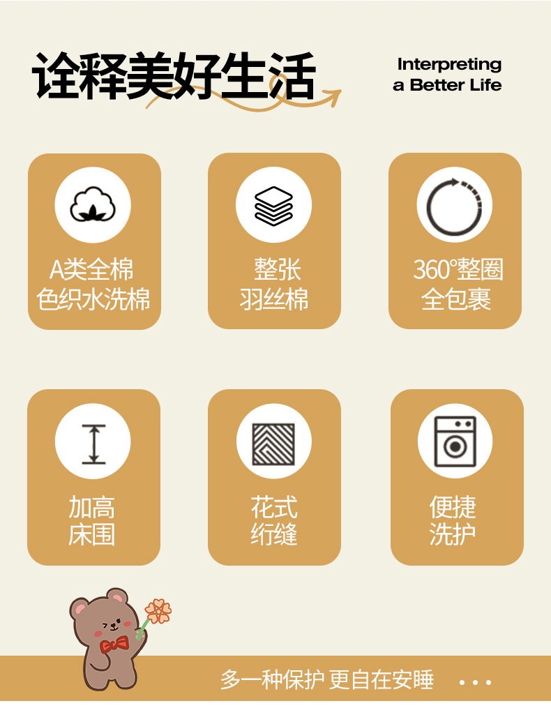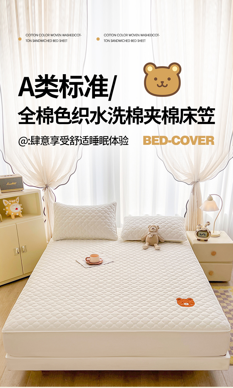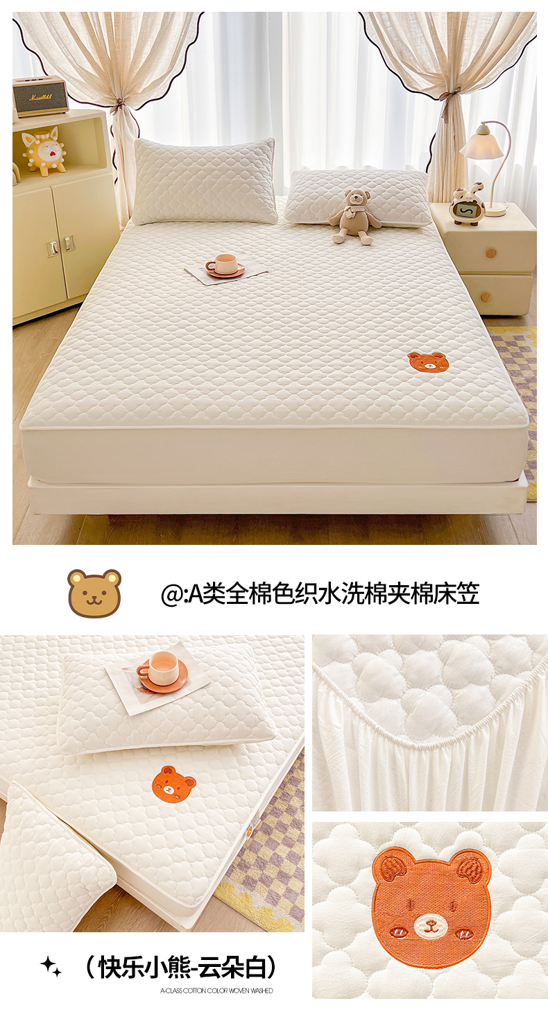 商品名称:伊人坊 2025新款全棉色织水洗棉夹棉床笠床垫保护套刺绣款 快乐小熊-云朵白