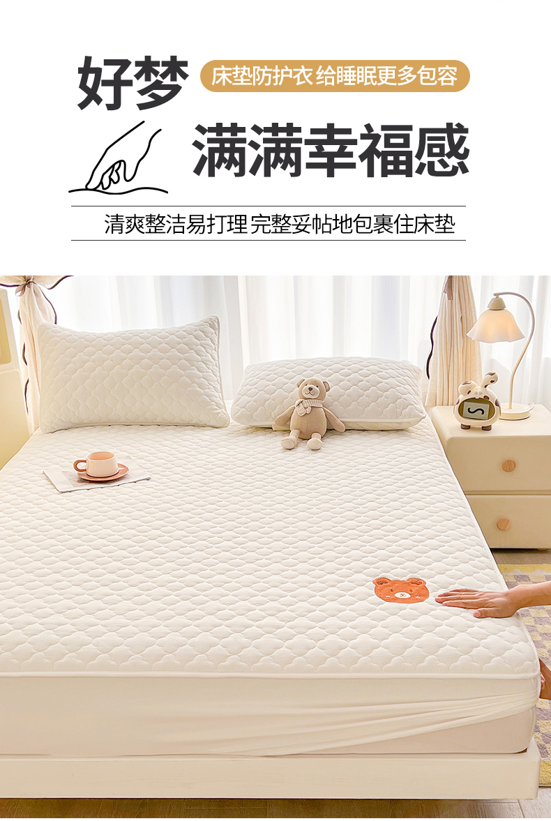 伊人坊 2025新款全棉色织水洗棉夹棉床笠床垫保护套刺绣款 快乐小熊-云朵白