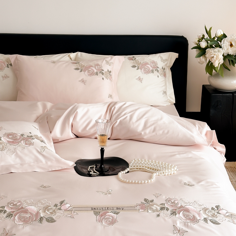 (总)佳汐蓝家纺 2025新款春夏新品TENCEL兰精天丝四件套绣花系列,花颜如梦·珍珠粉,花颜如梦·珍珠绿